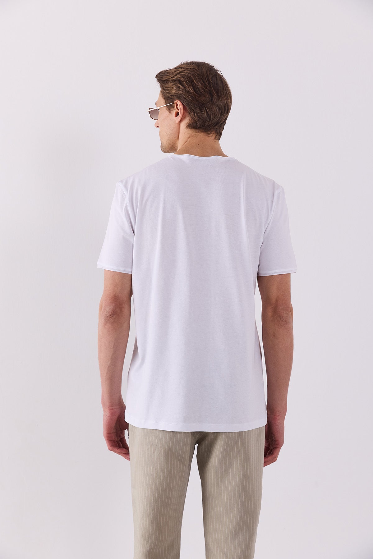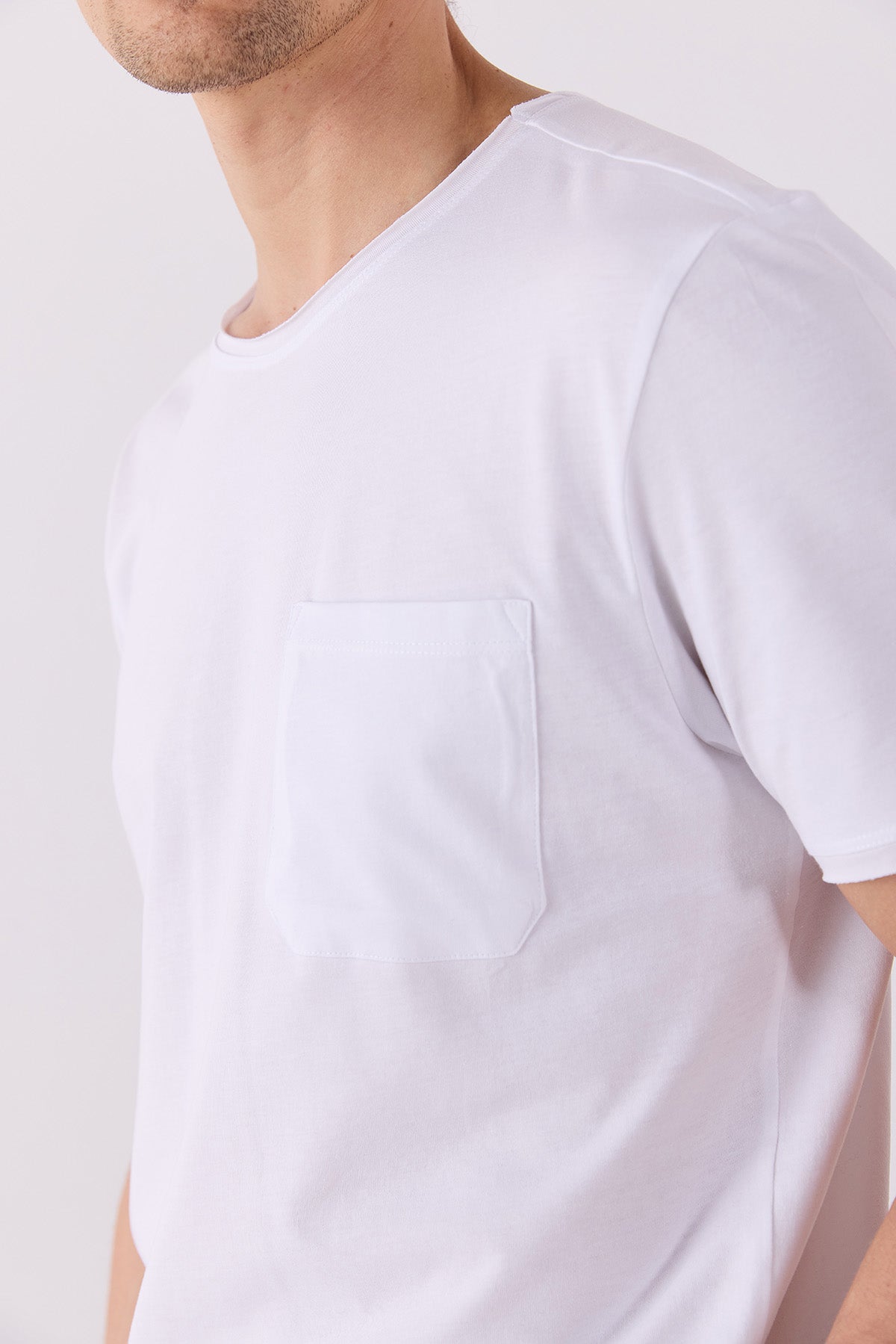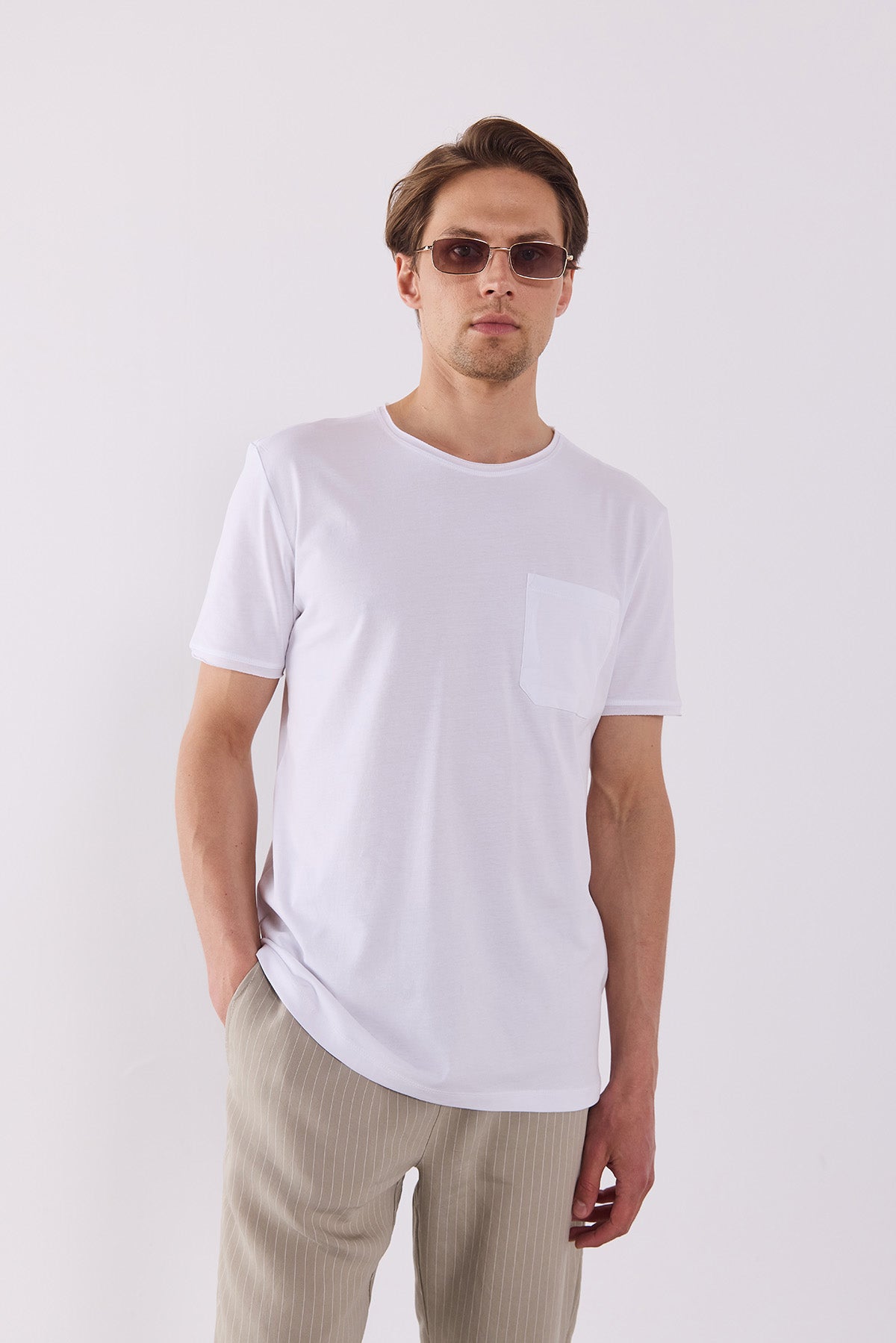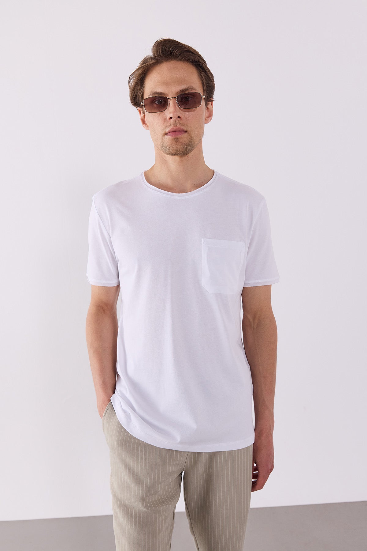 Erkek Simon Bisiklet Yaka Cep Detaylı Basic Tişört %100 Pamuk - Beyaz