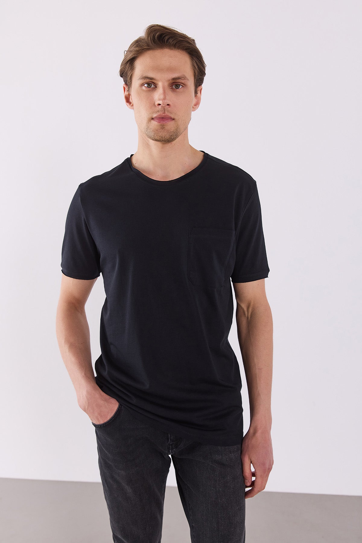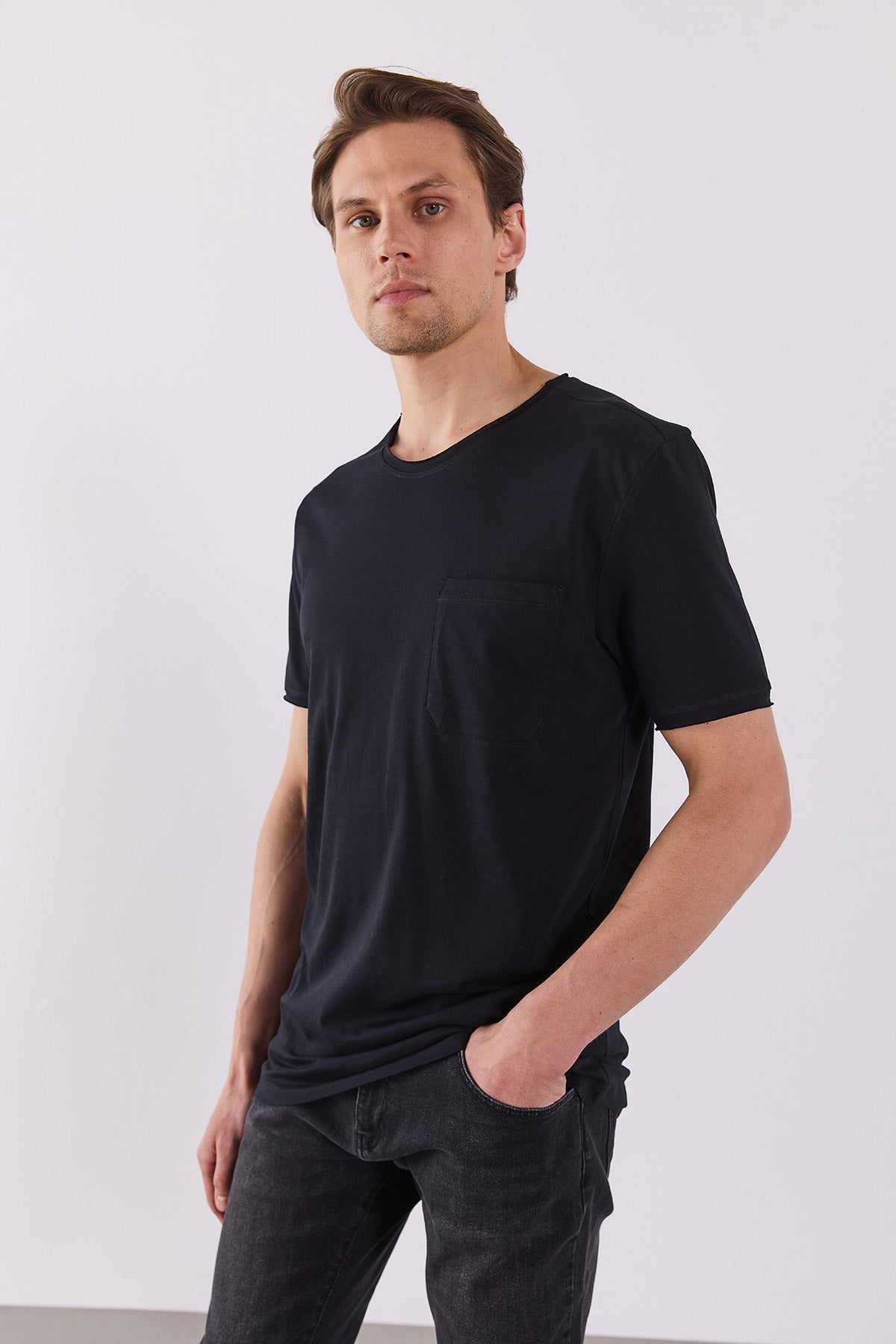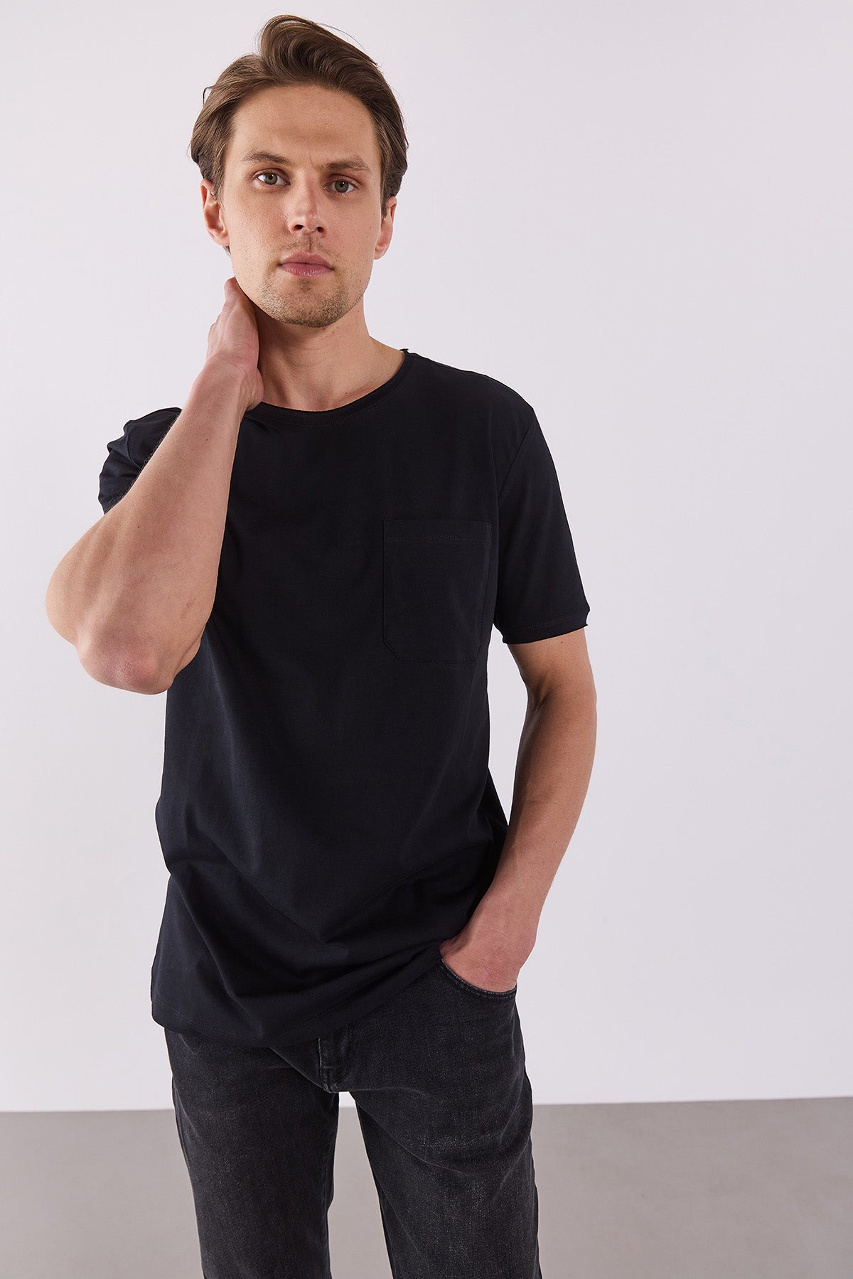 Erkek Simon Bisiklet Yaka Cep Detaylı Basic Tişört %100 Pamuk - Siyah
