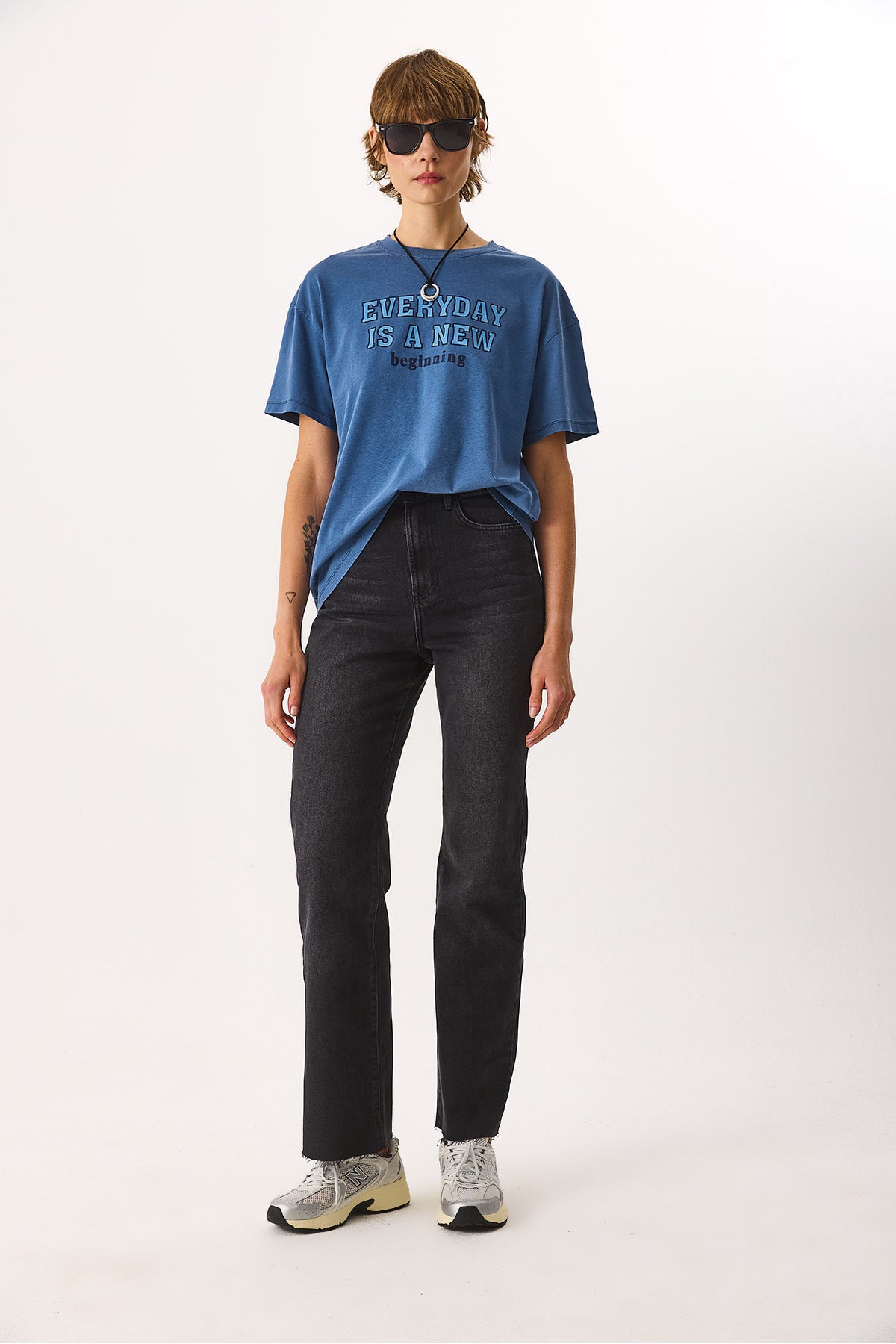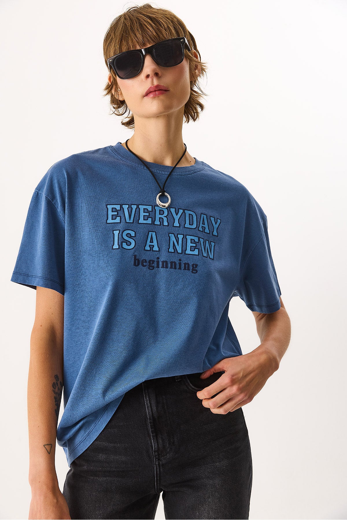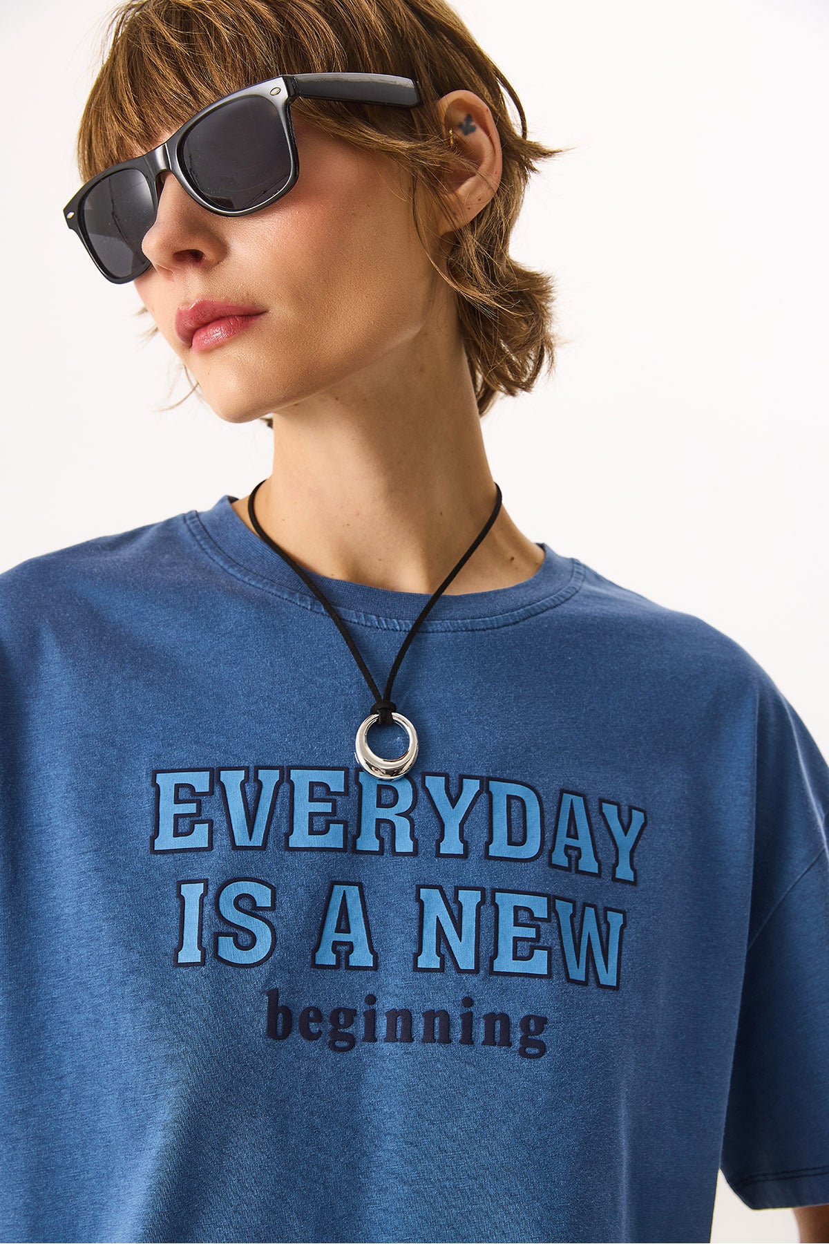 Kadın Sülfür Boyalı Baskılı Tişört %100 Pamuk - Navy