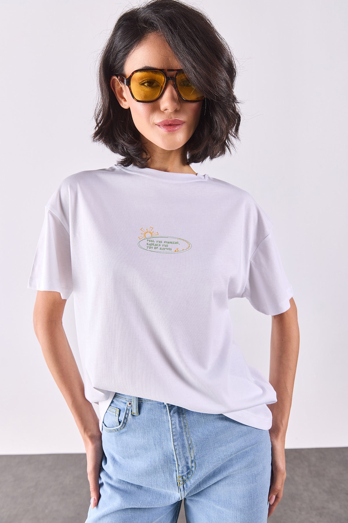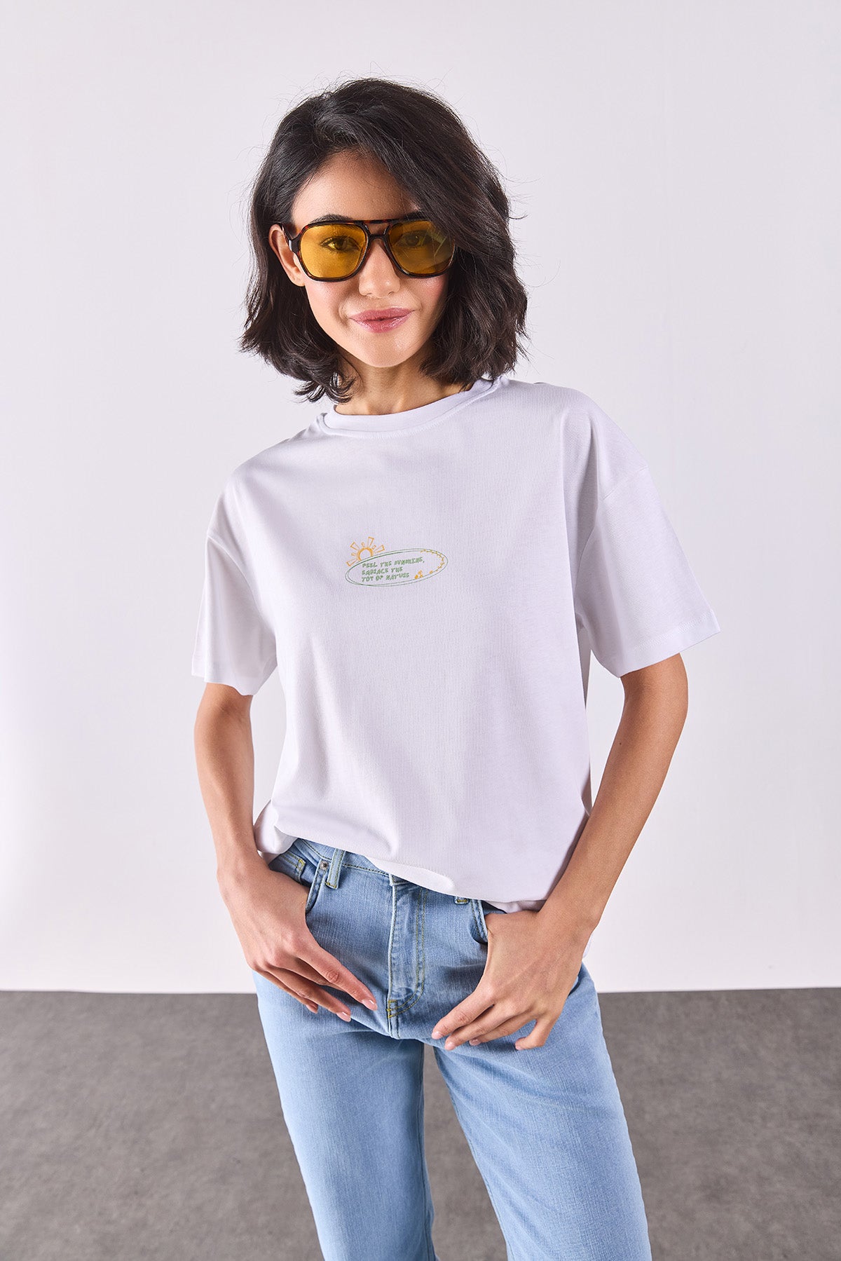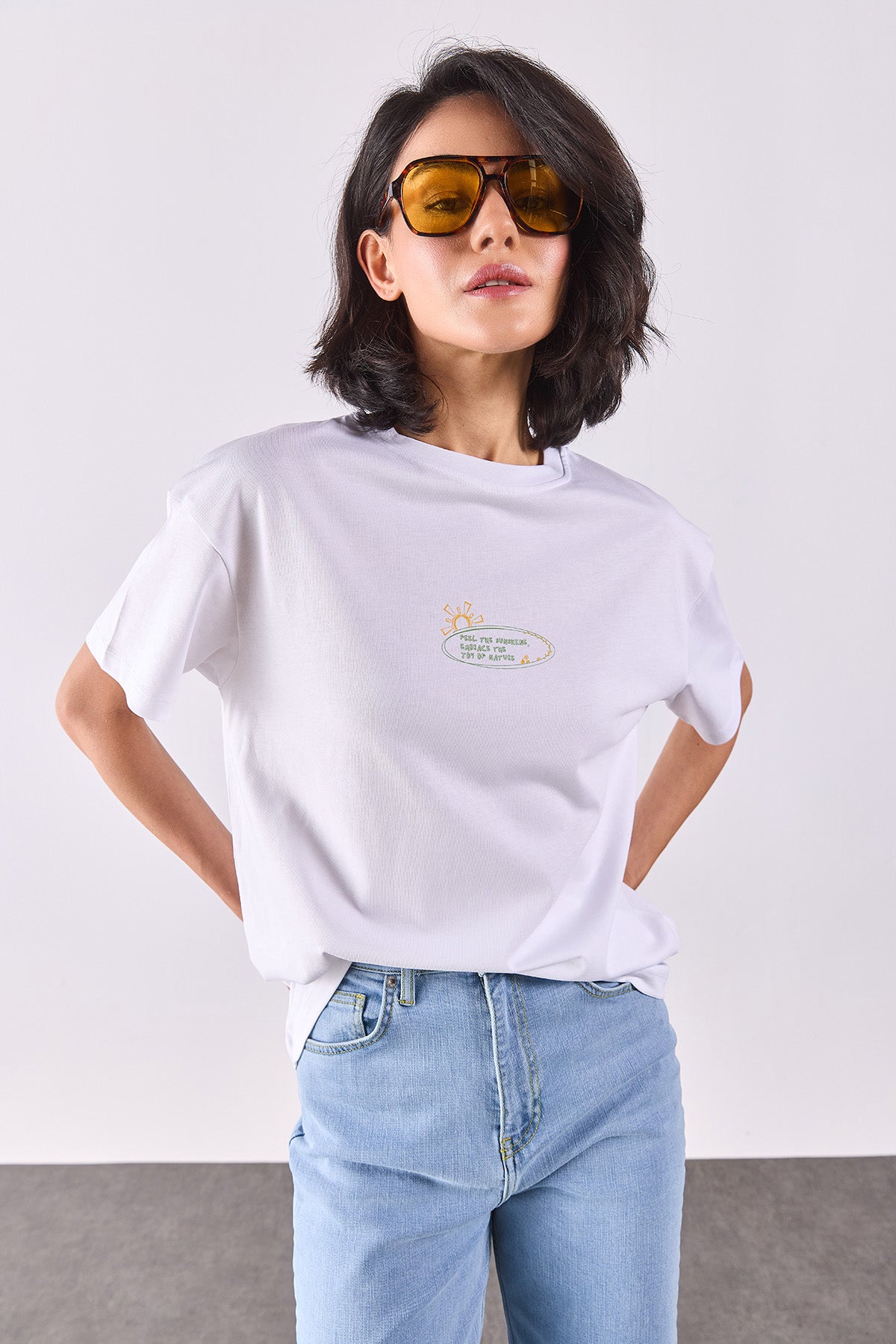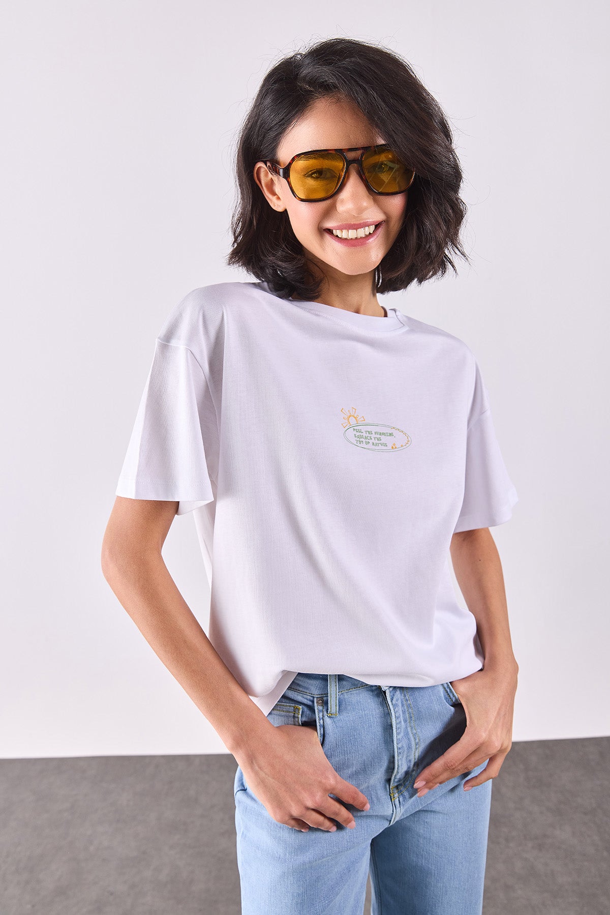 Kadın Sunshine Baskılı Tişört %100 Pamuk - Beyaz