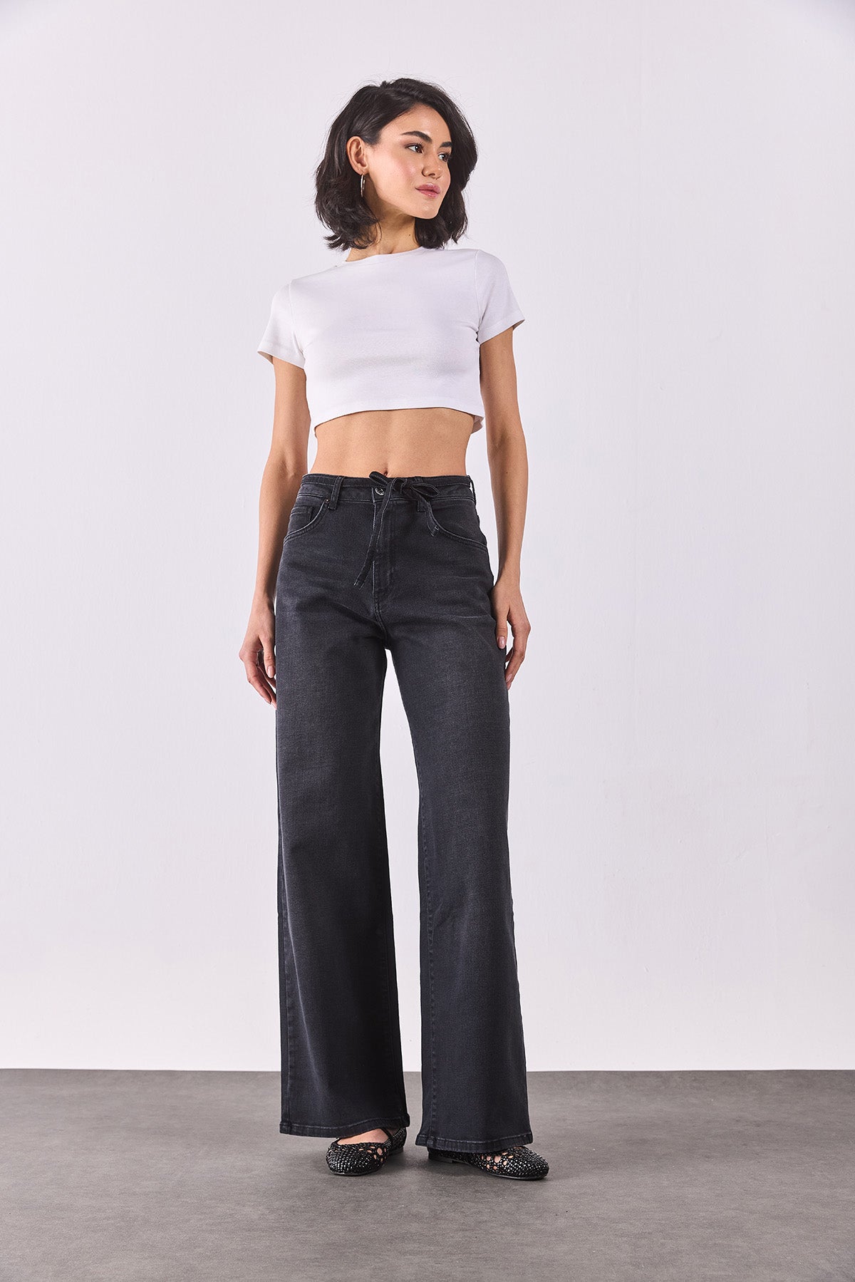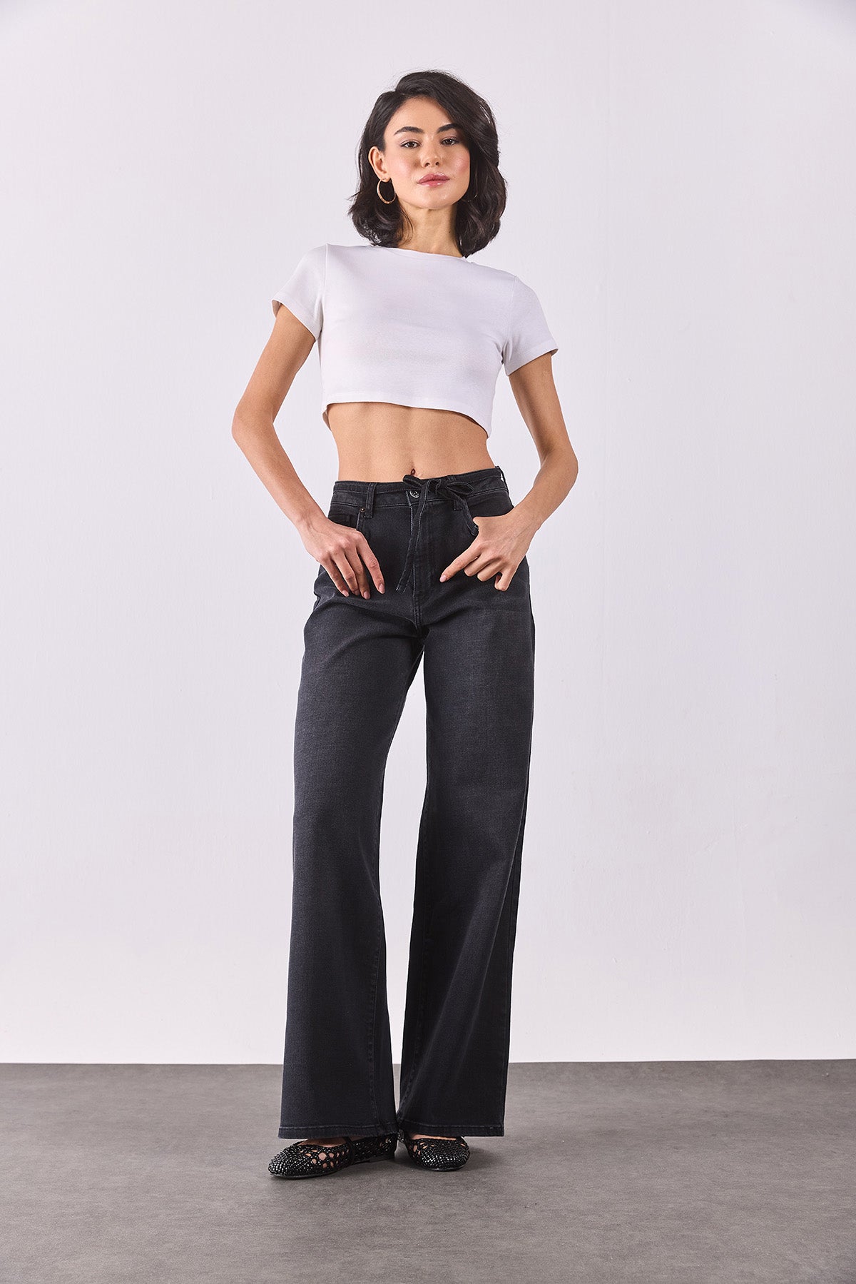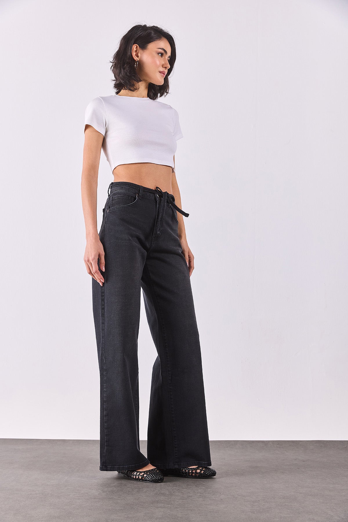 Kadın Sydney Kemer Detaylı Black Wide Leg Jean Pantolon - Black