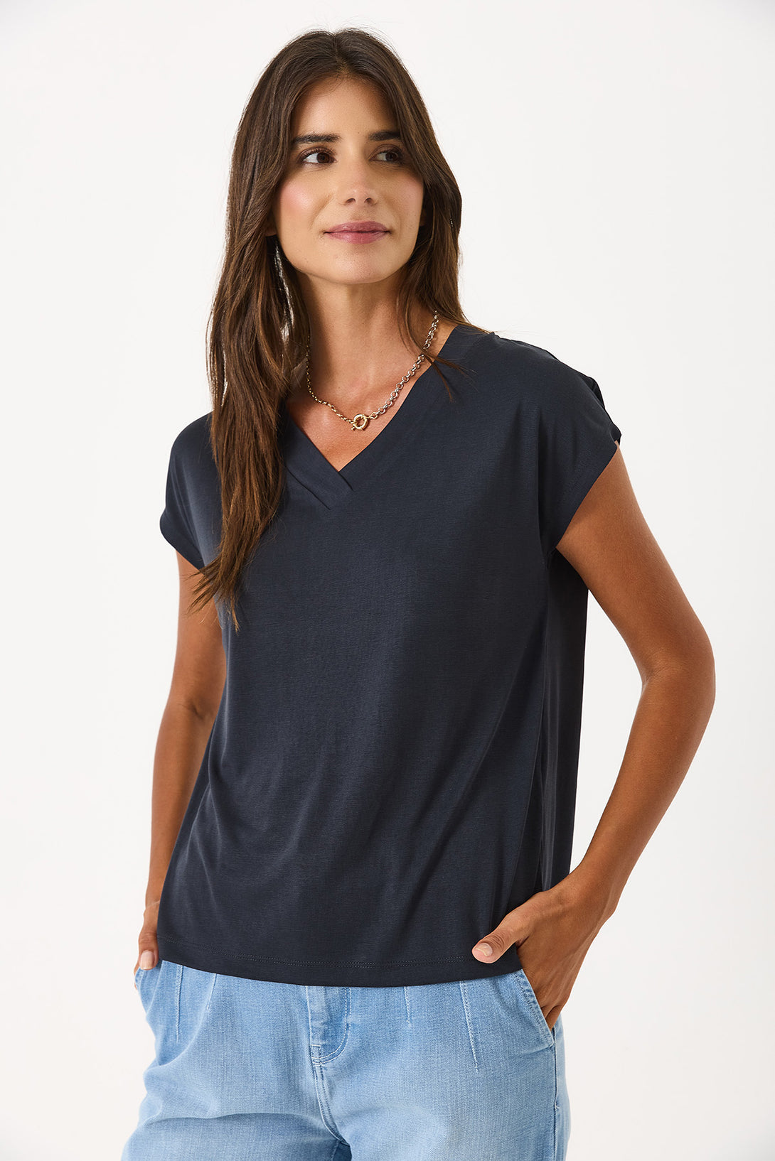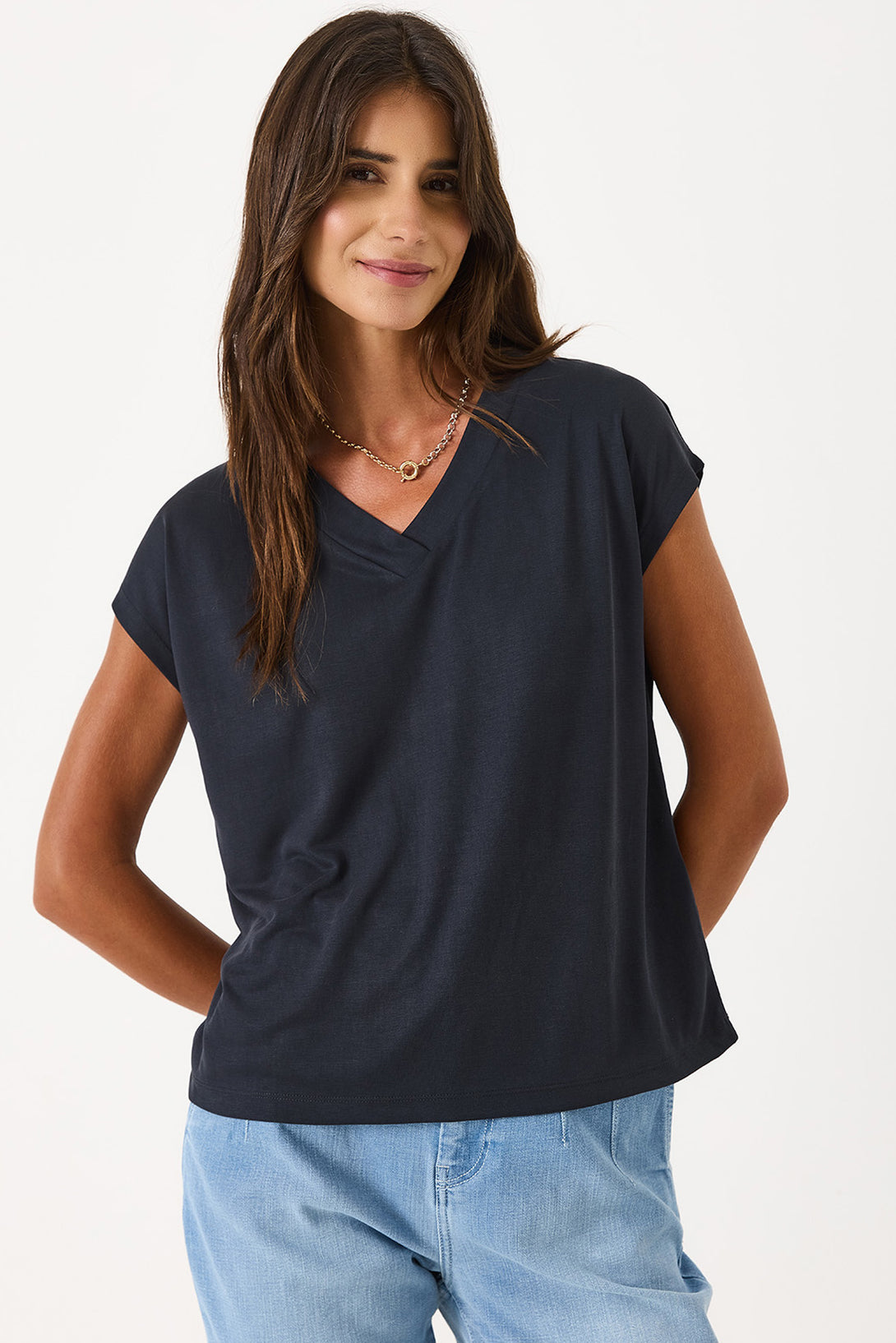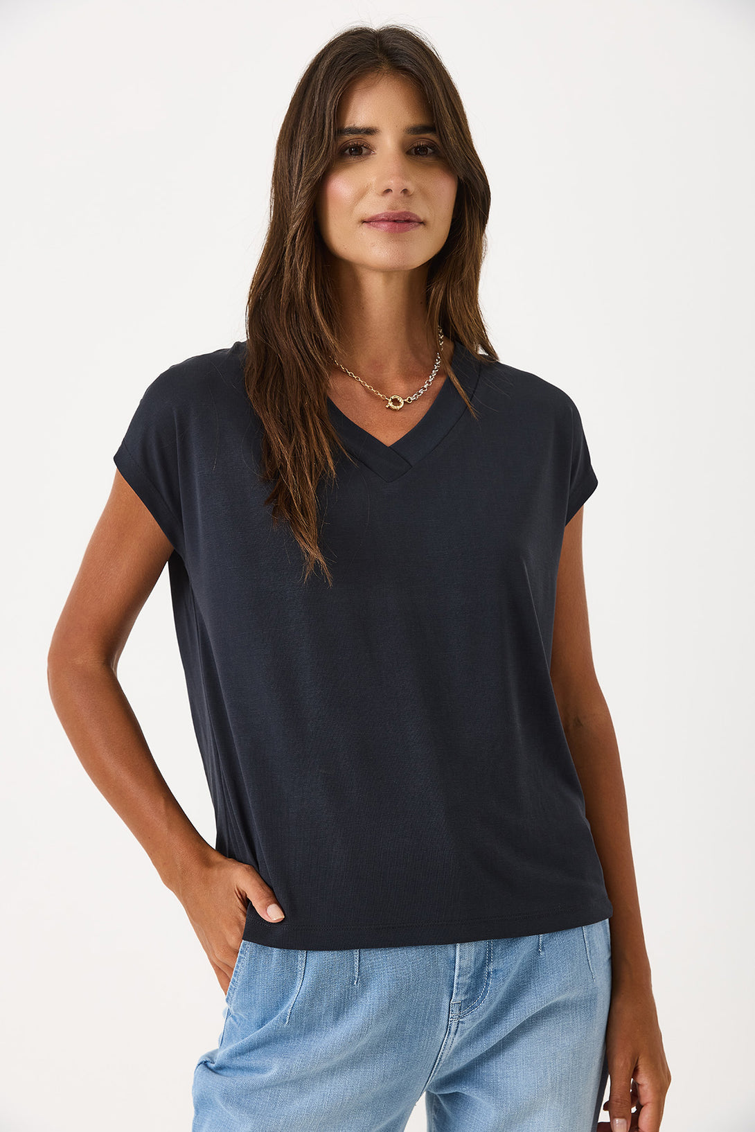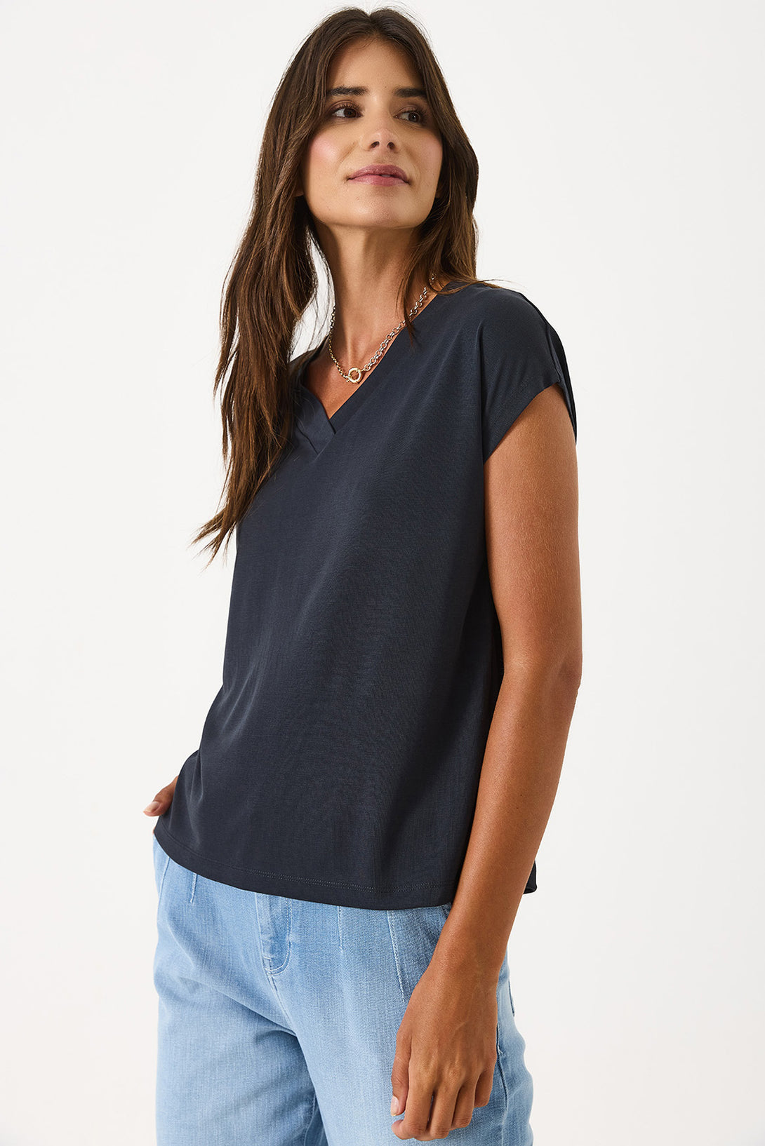 Doğal ve yumuşak dokusuyla cildinizde nazik bir his bırakır. %78 Modal ve %22 Polyester karışımı kumaştan üretilen bu V yaka tişört, rahat kalıbı ile günlük şıklığınızı tamamlar. %78 Modal. %22 Polyester. V yaka. Rahat kalıp. Yumuşak dokulu kumaş. Konfor ve stilin buluştuğu, her anınıza uyum sağlayan temel parça.