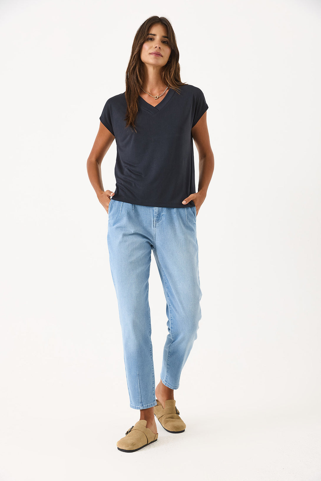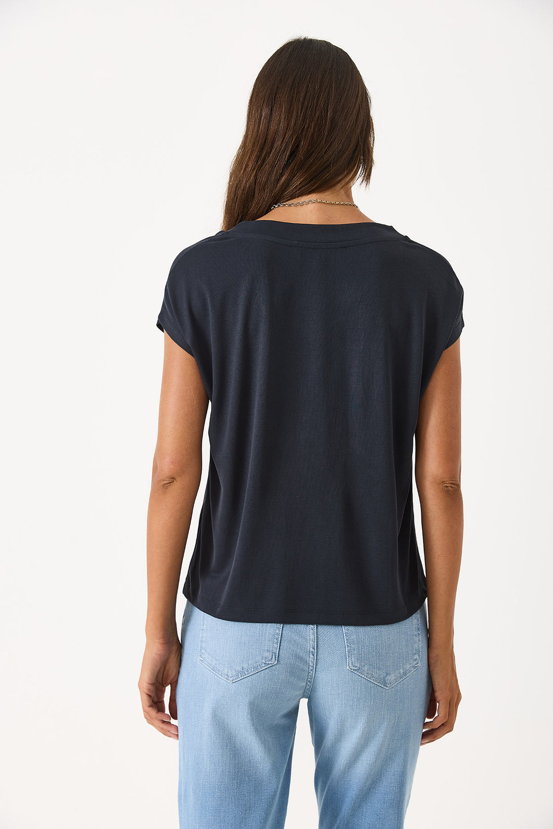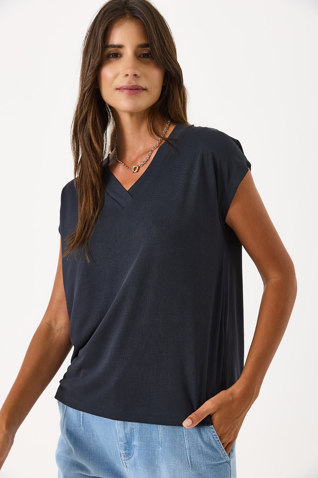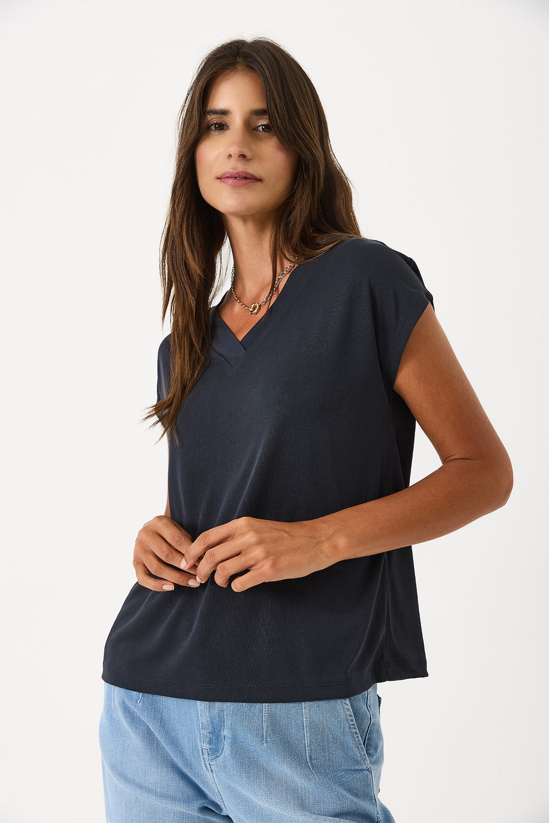 Doğal ve yumuşak dokusuyla cildinizde nazik bir his bırakır. %78 Modal ve %22 Polyester karışımı kumaştan üretilen bu V yaka tişört, rahat kalıbı ile günlük şıklığınızı tamamlar. %78 Modal. %22 Polyester. V yaka. Rahat kalıp. Yumuşak dokulu kumaş. Konfor ve stilin buluştuğu, her anınıza uyum sağlayan temel parça.