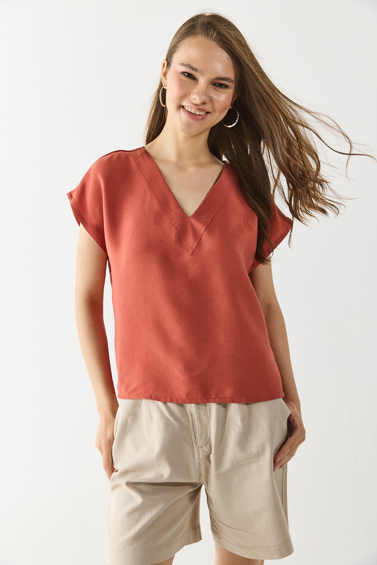 Kadın V Yakalı Bluz (CUPRO) - Kiremit