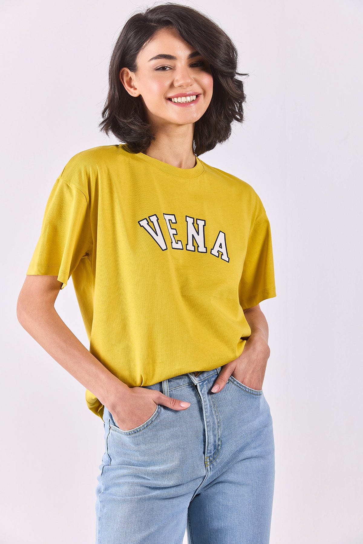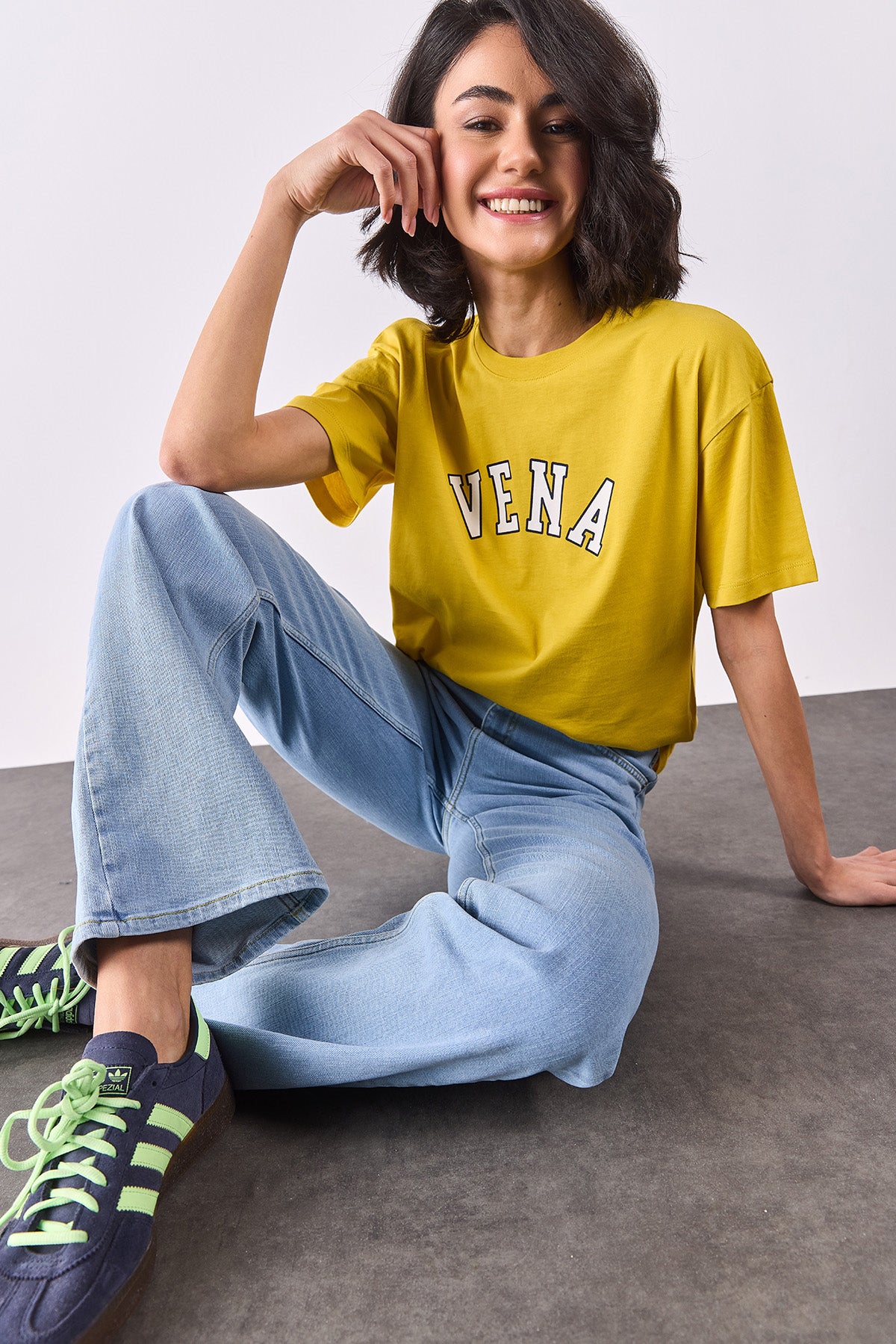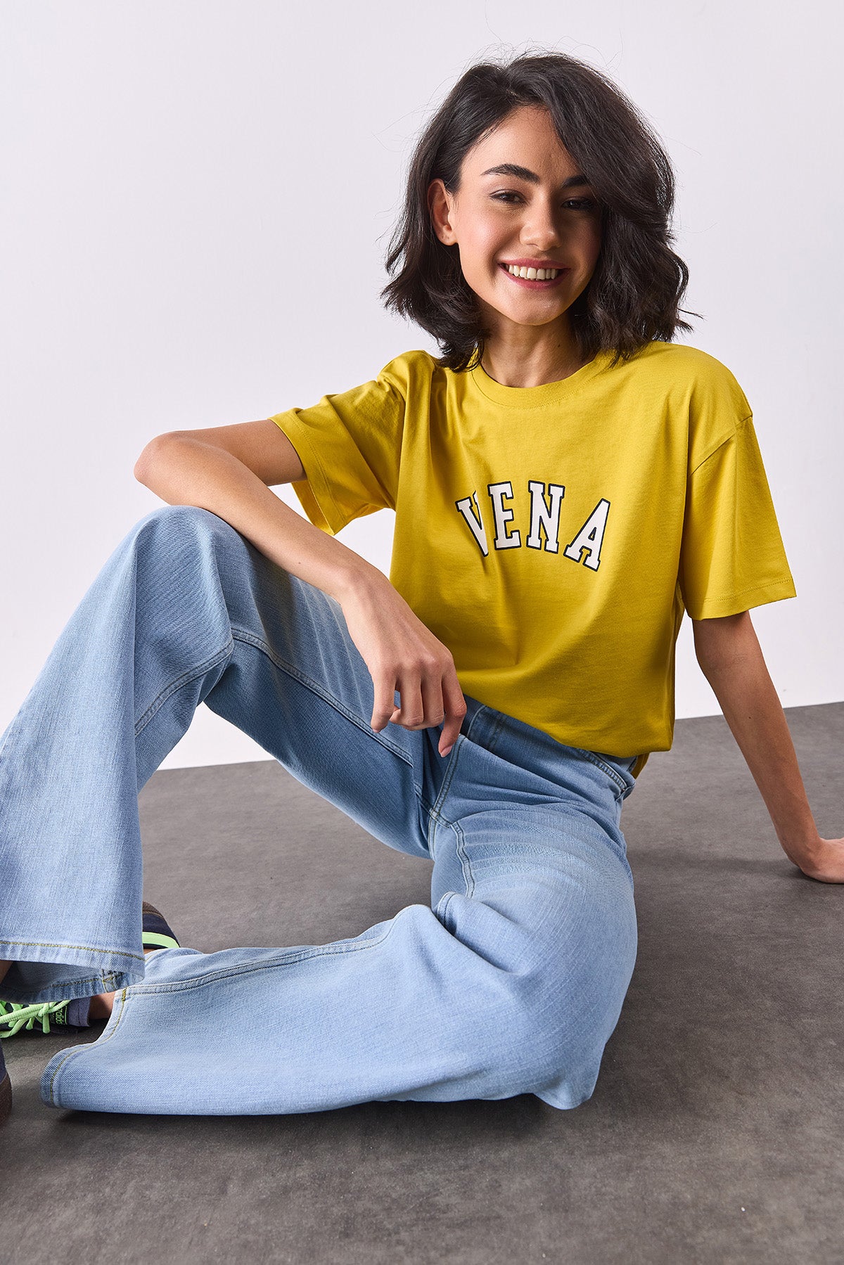 Kadın Vena Jeans Baskılı Bisiklet Yaka Regular Fit Tişört %100 Pamuk - Sarı