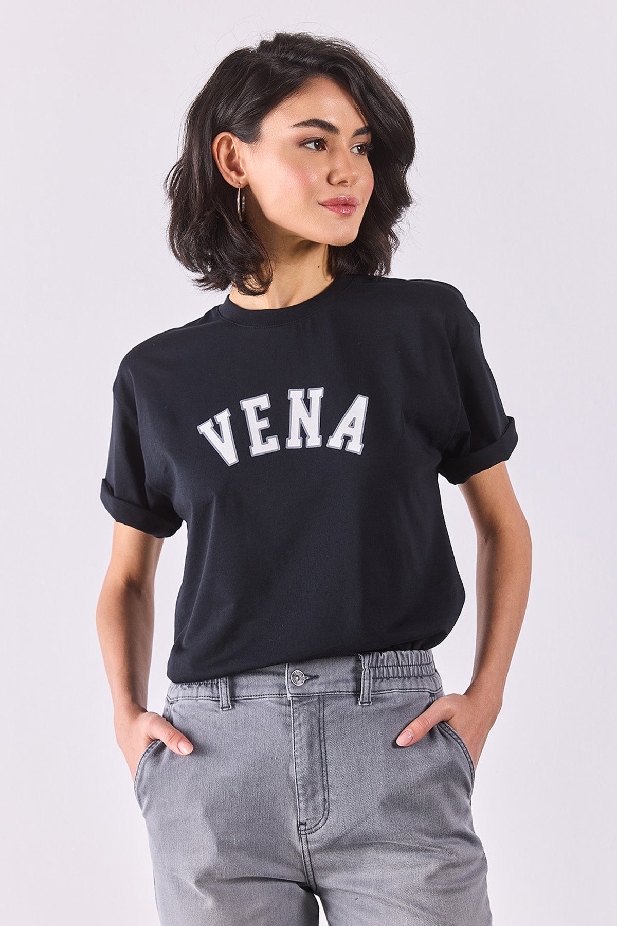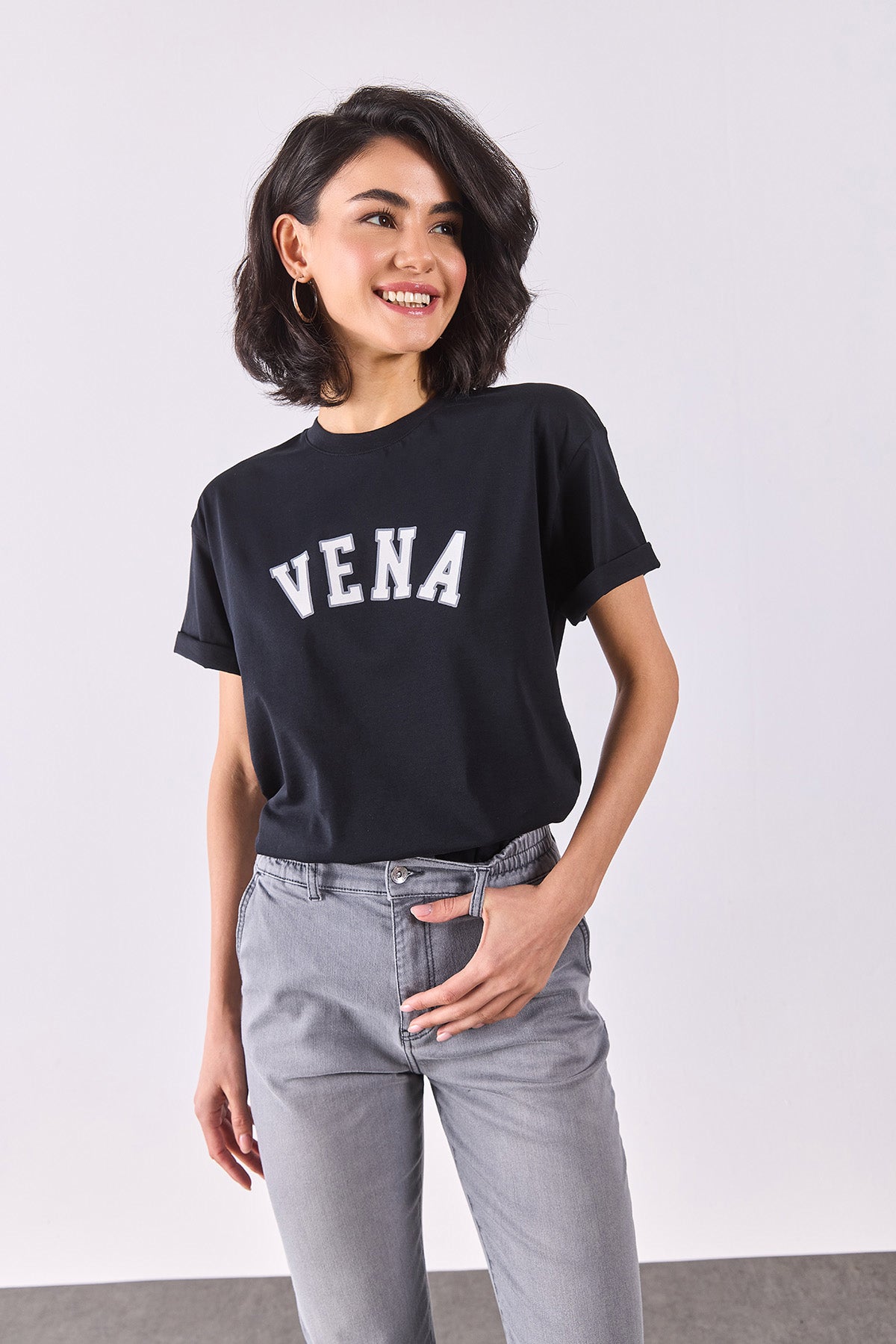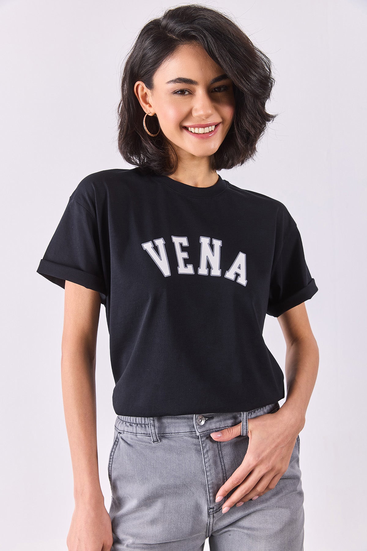 Kadın Vena Jeans Baskılı Bisiklet Yaka Regular Fit Tişört %100 Pamuk - Siyah