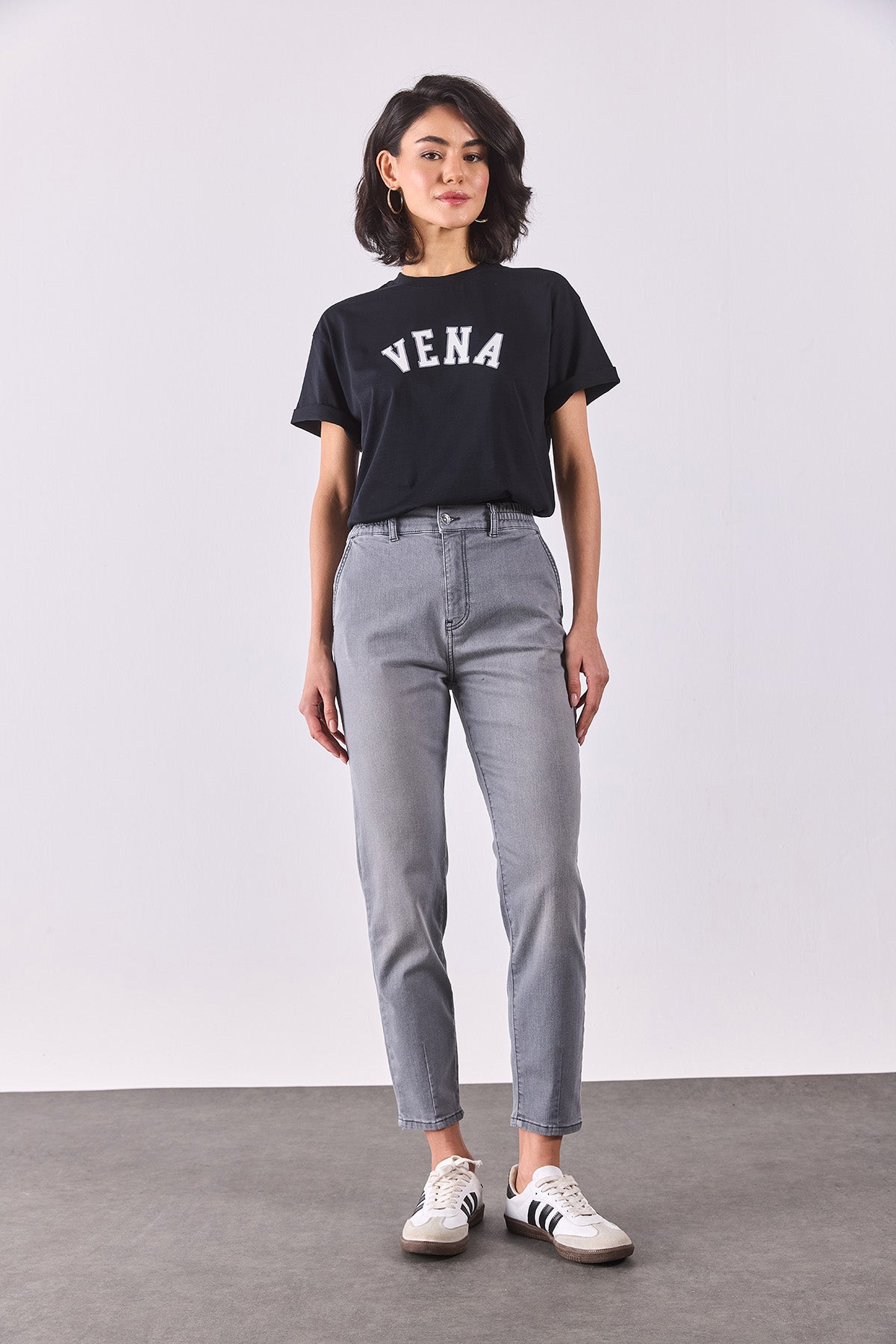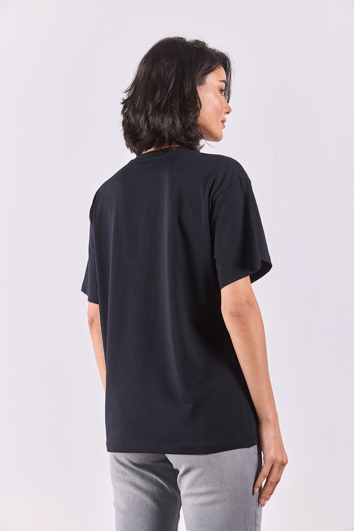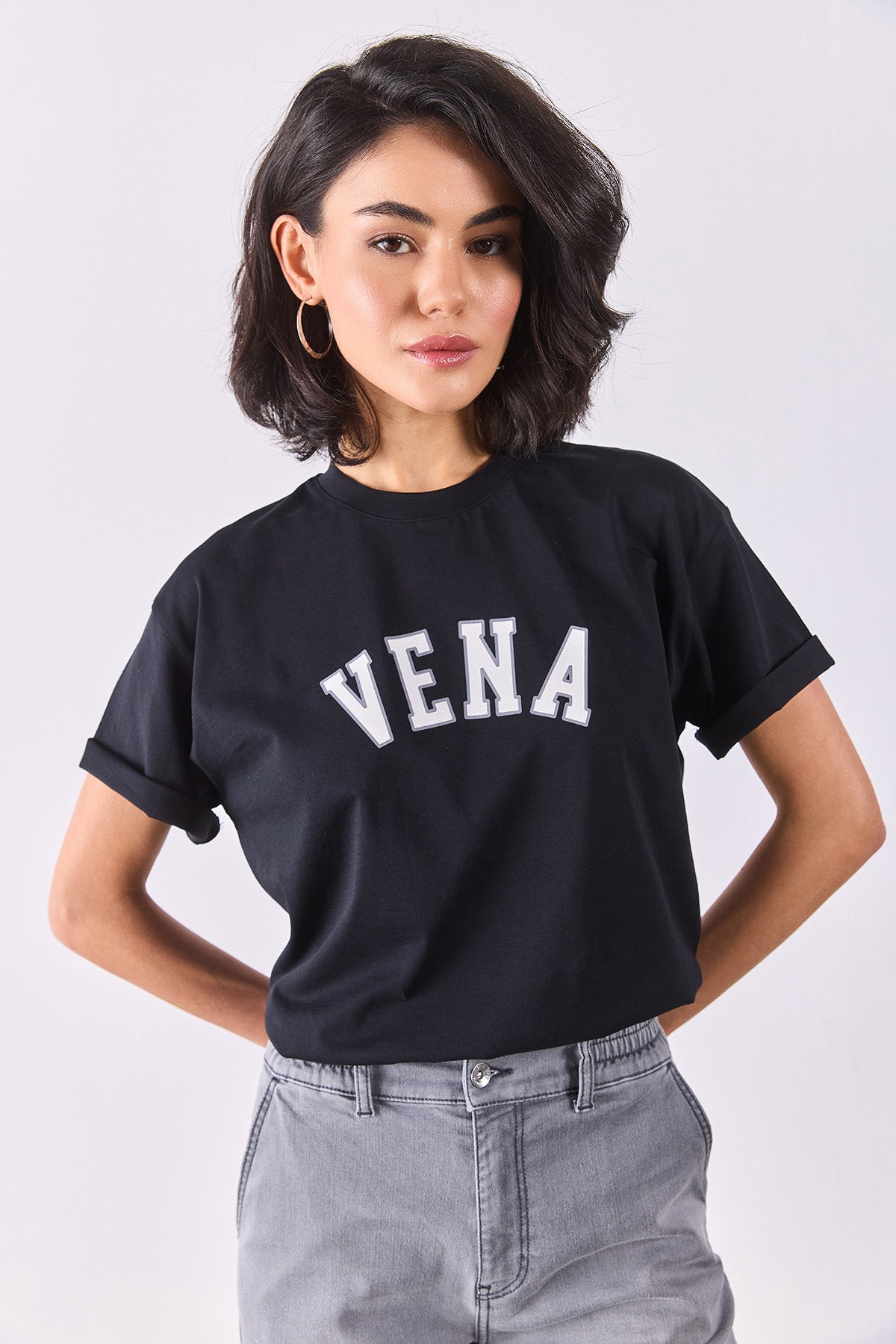 Kadın Vena Jeans Baskılı Bisiklet Yaka Regular Fit Tişört %100 Pamuk - Siyah