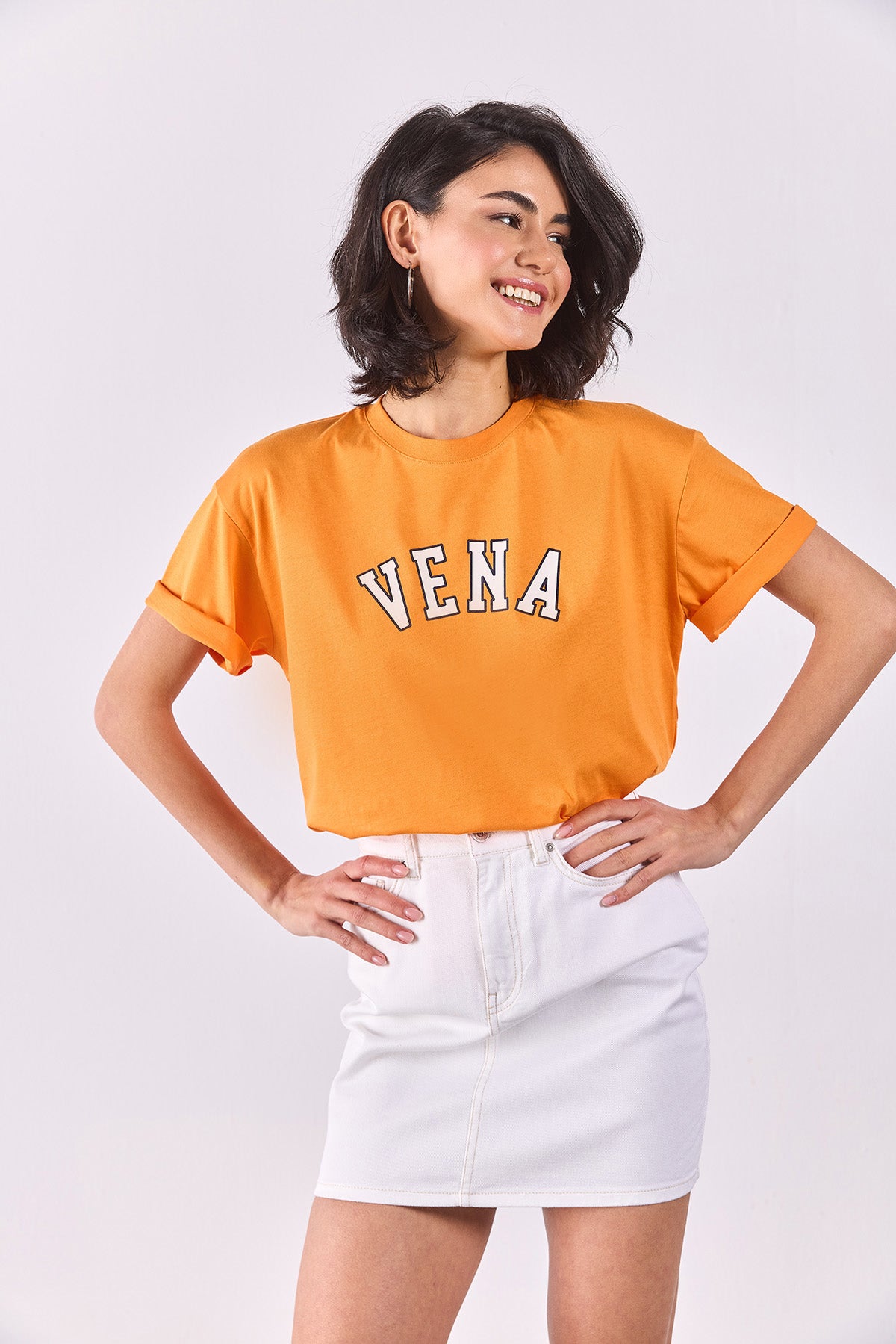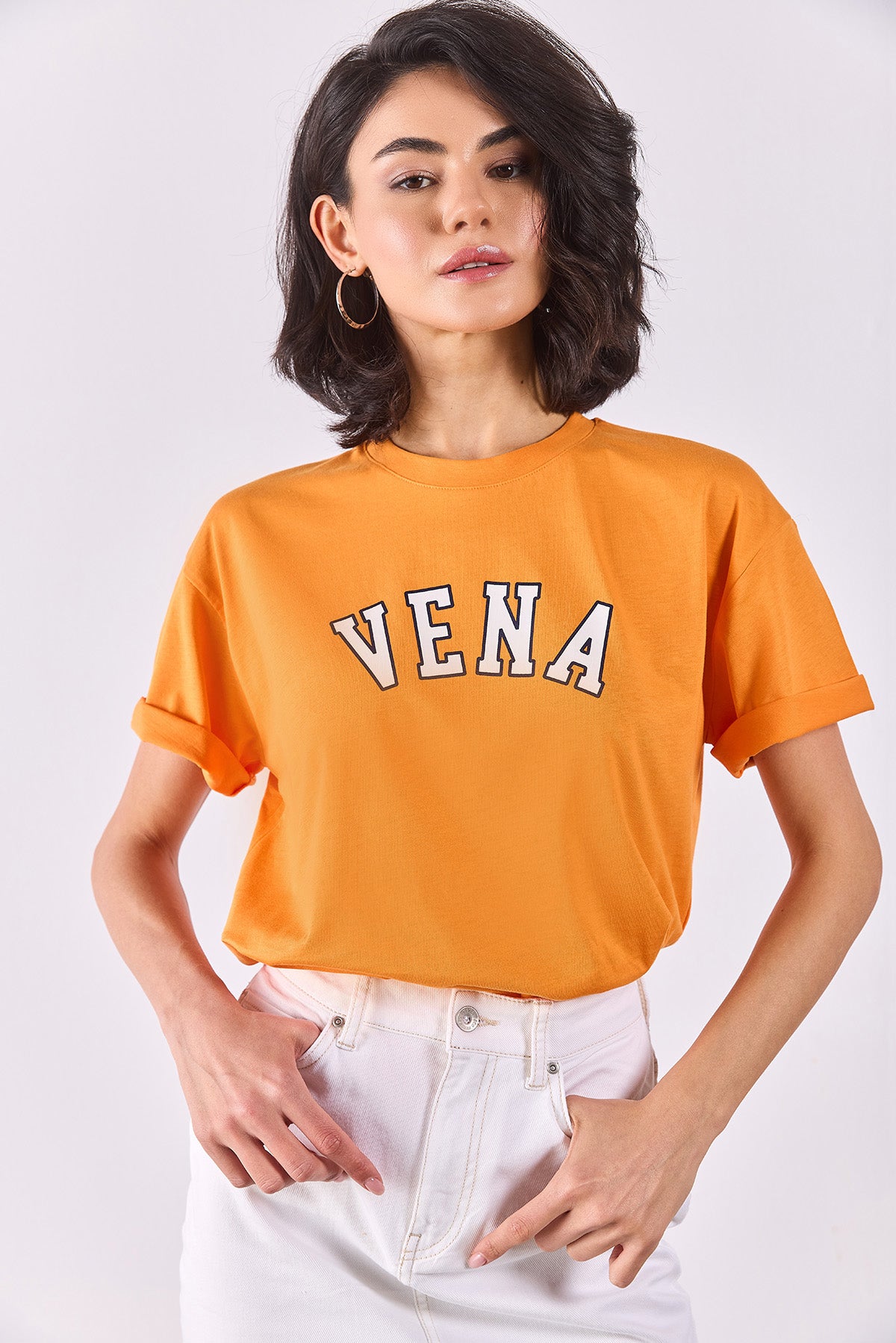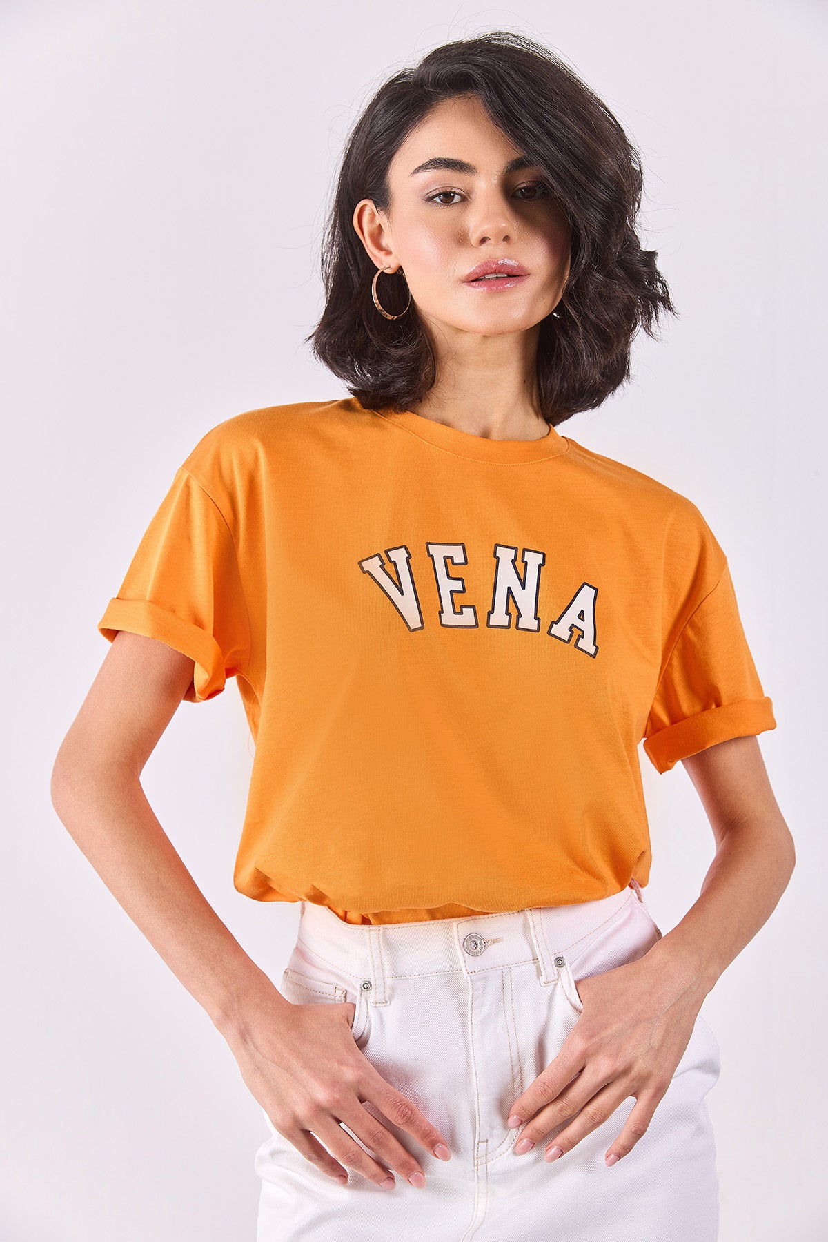 Kadın Vena Jeans Baskılı Bisiklet Yaka Regular Fit Tişört %100 Pamuk - Turuncu