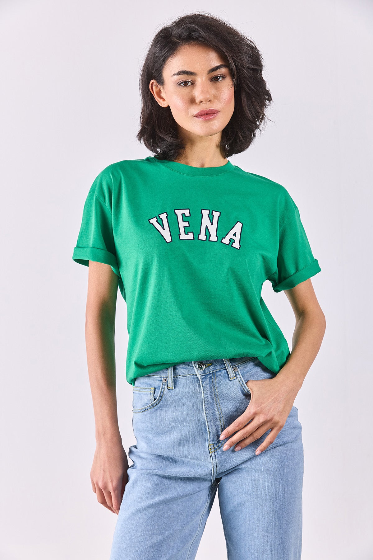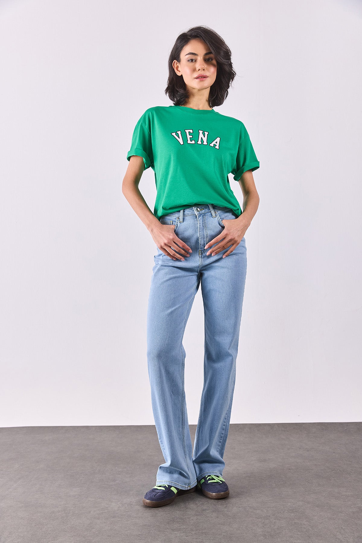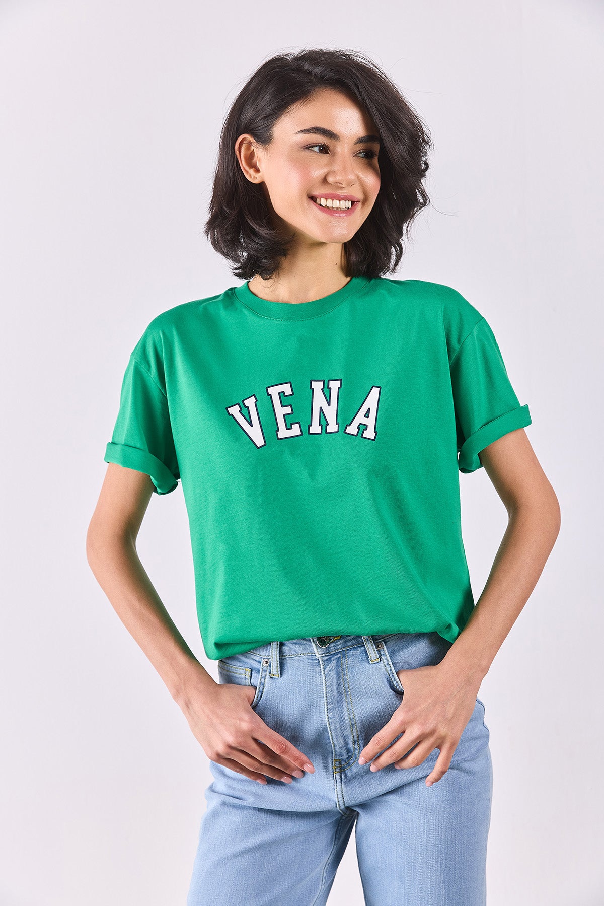 Kadın Vena Jeans Baskılı Bisiklet Yaka Regular Fit Tişört %100 Pamuk - Yeşil