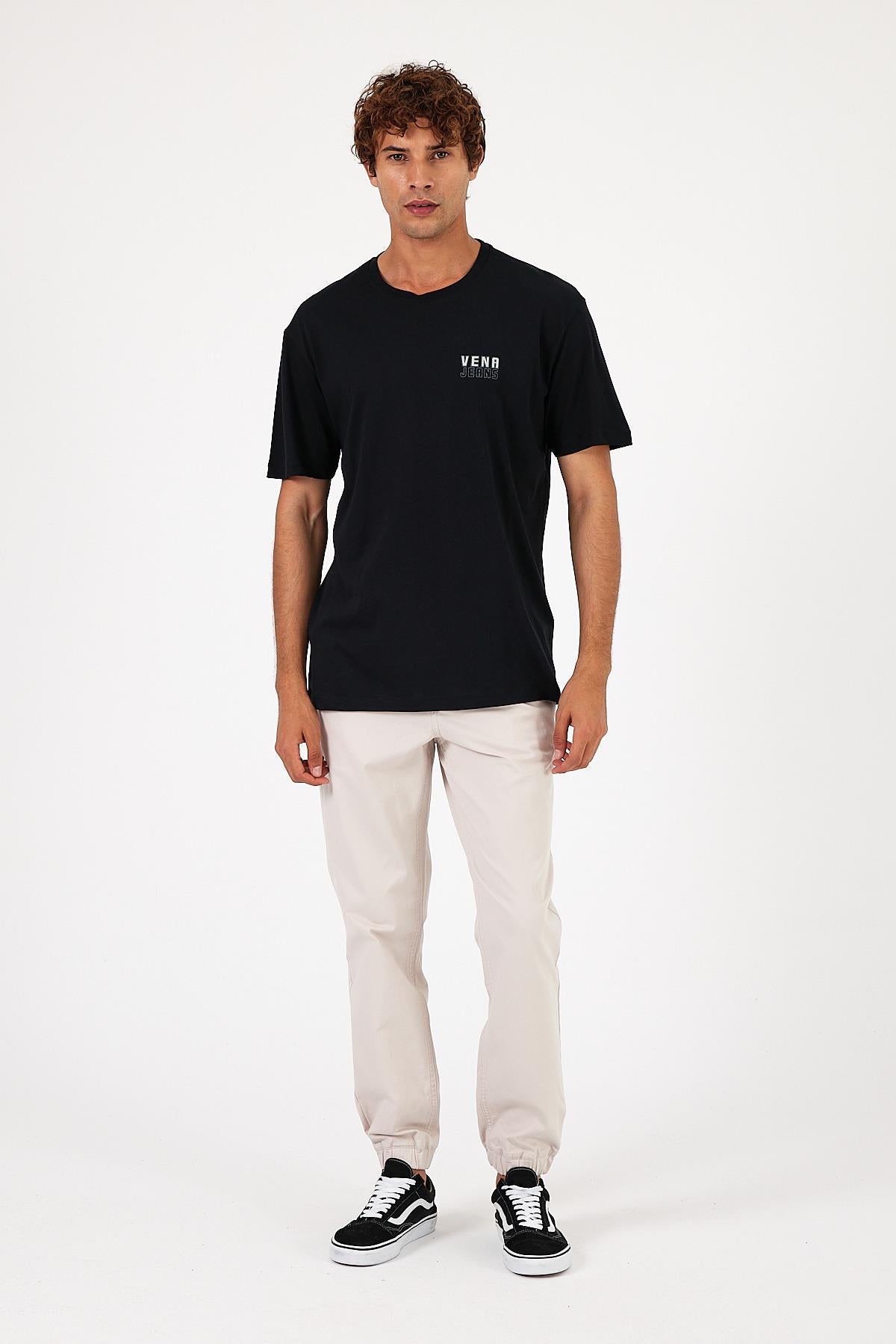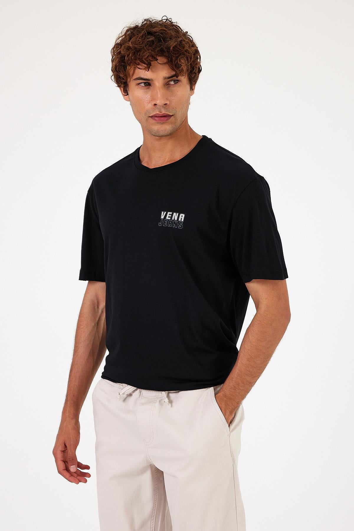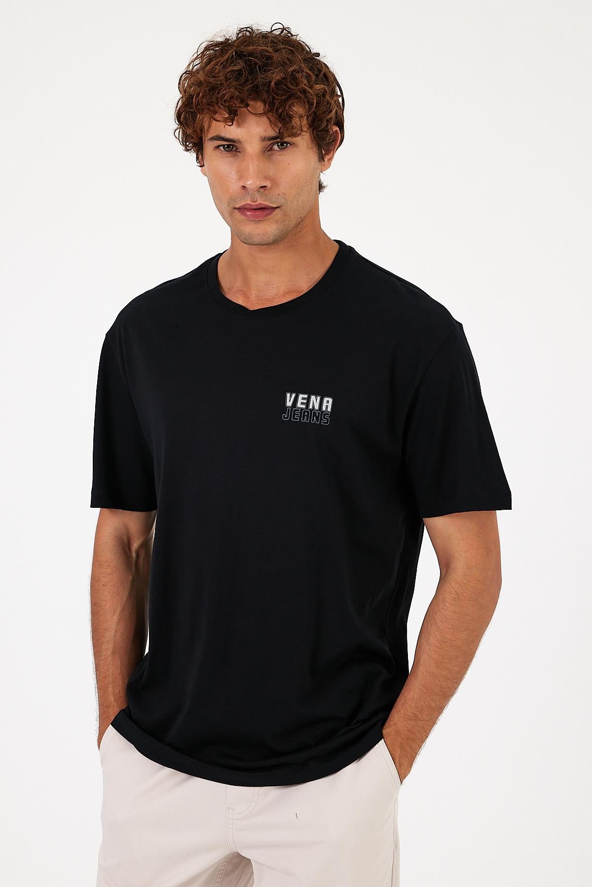 Erkek Vena Logo Kabartma Baskılı Bisiklet Yaka Tişört %100 Pamuk - Siyah