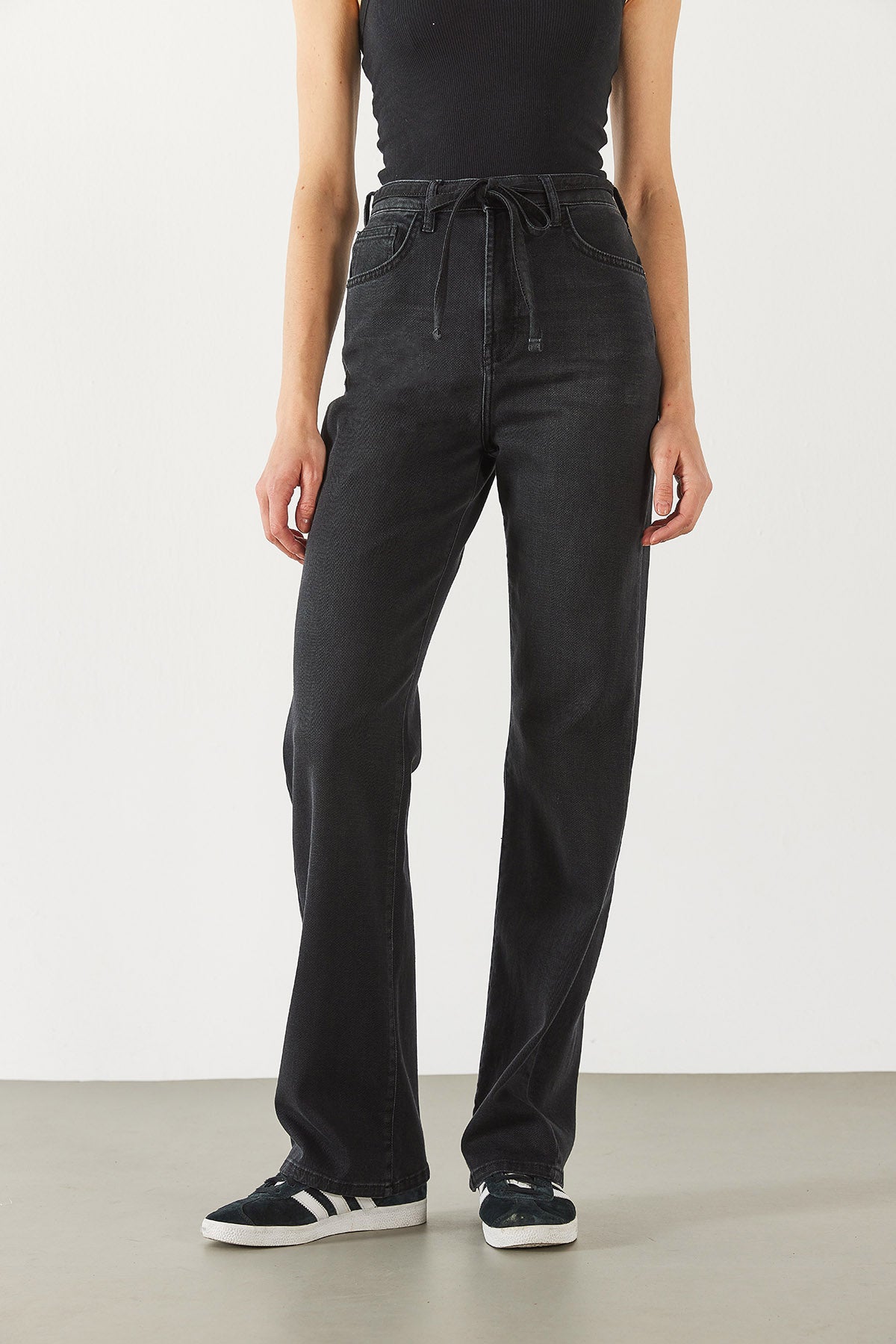 Kadın Wanda Kemer Detaylı Black Wide Leg Jean Pantolon %100 Pamuk - Black