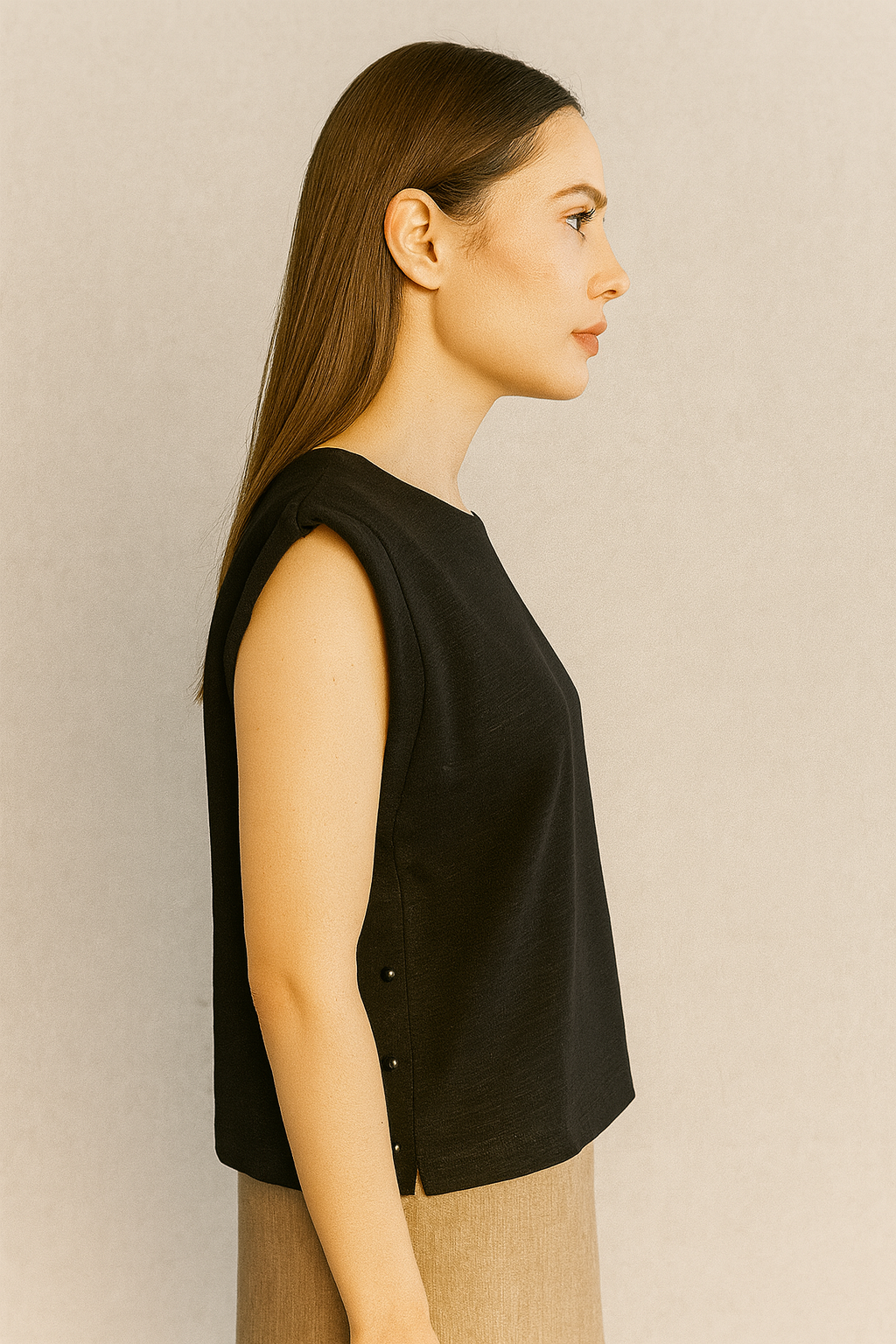 Yanı Düğme Detaylı Kalın %100 Pamuk Tişört - SİYAH