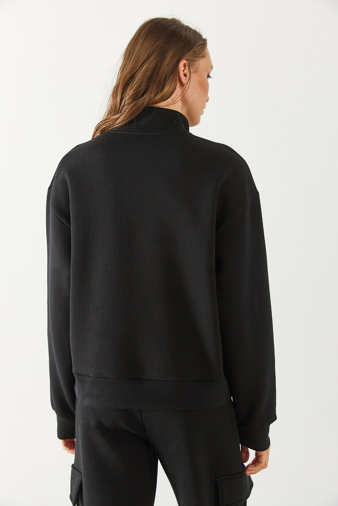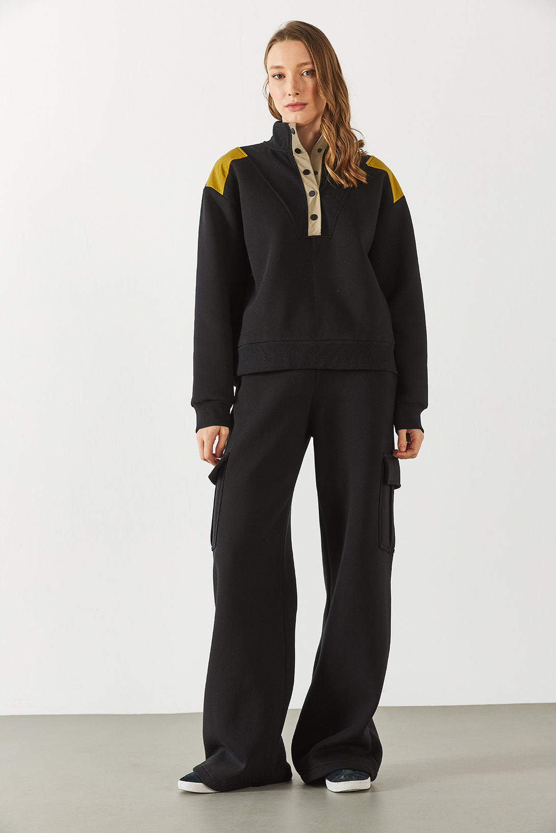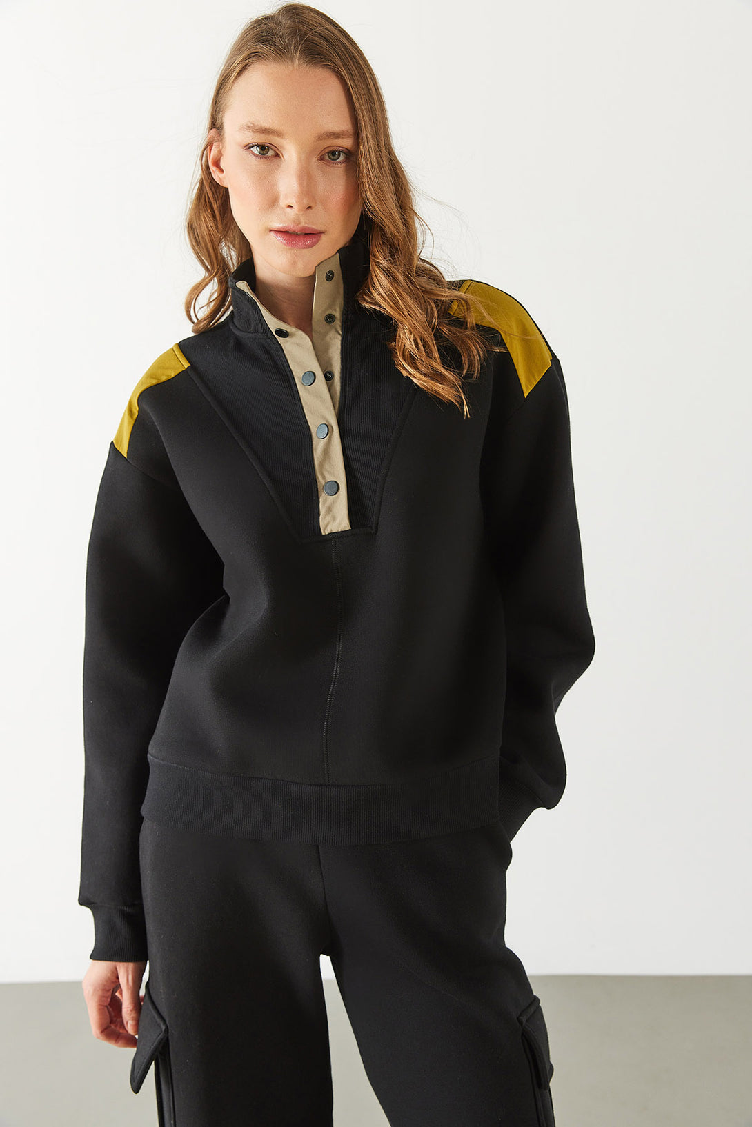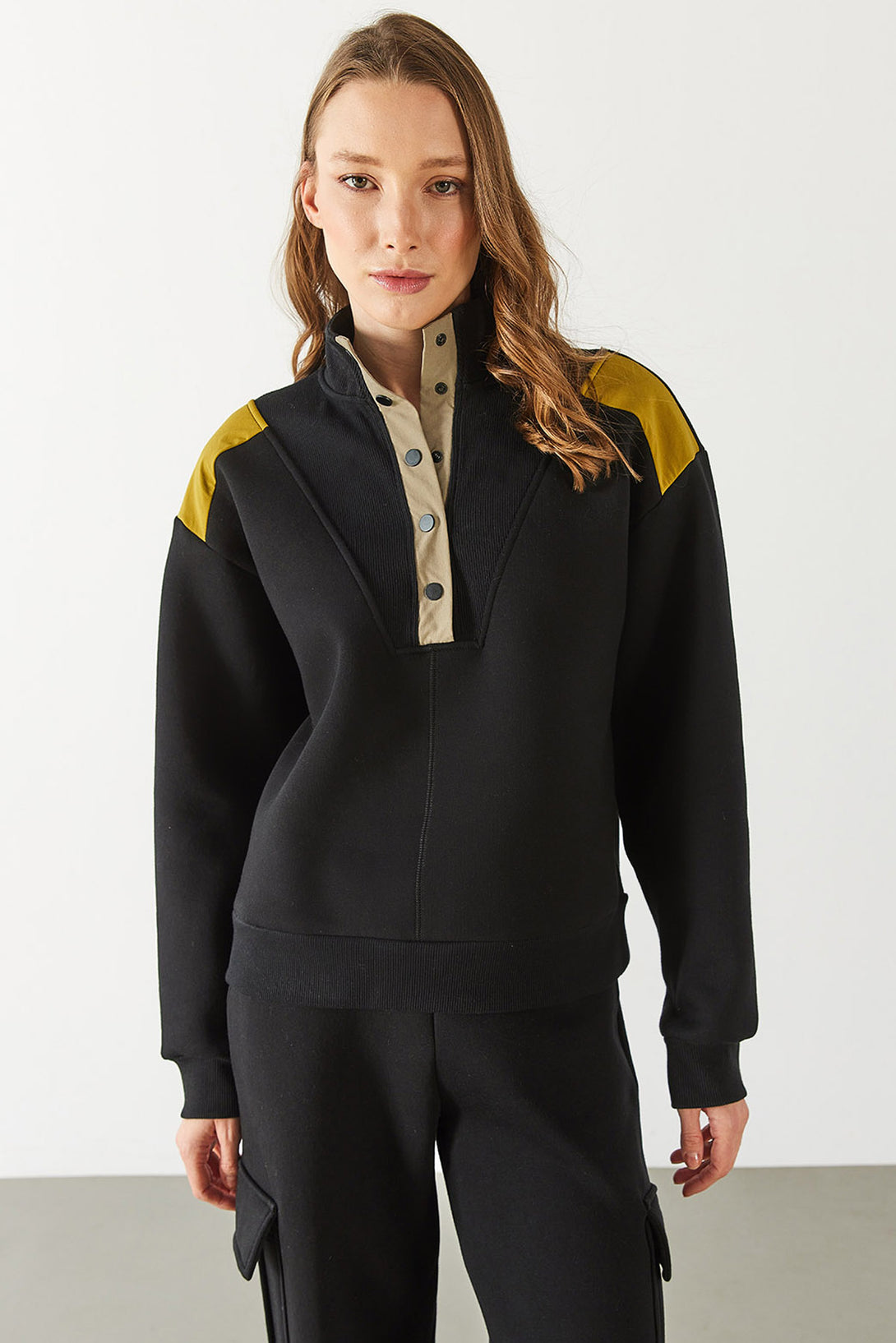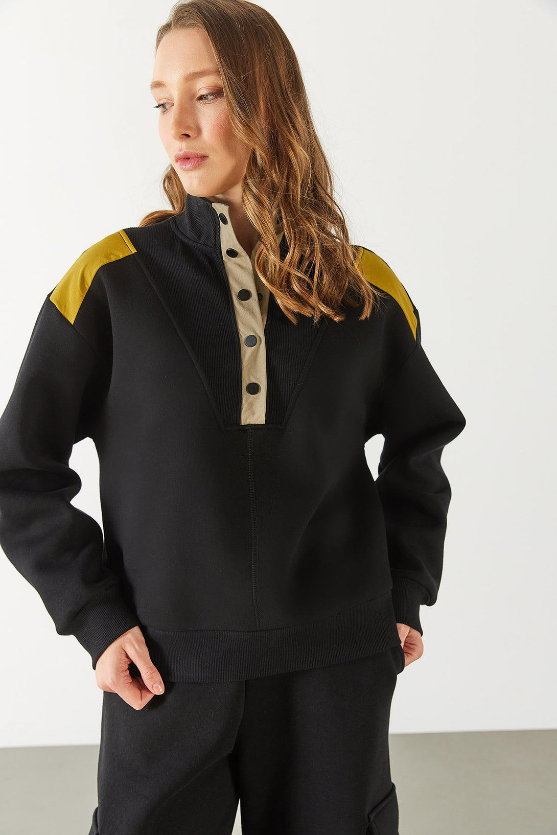 Yarım Patlı Kontrast Detaylı Sweatshirt - SİYAH